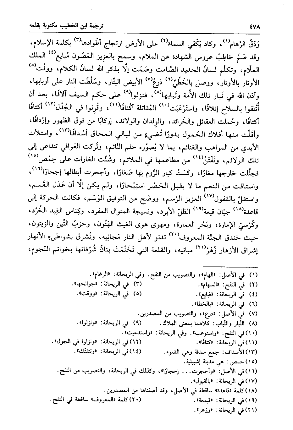 ودق الرّهام «1» ، وكاد يكفي السماء «2» على الأرض ارتجاج أطوادها «3» بكلمة الإسلام، وقد صمّ خاطب عروس الشهادة عن الملام، وسمح بالعزيز المصون مبايع «4» الملك العلّام، وتكلّم لسان الحديد الصّامت وصمت إلّا بذكر الله لسان الكلام، ووفّت «5» الأوتار بالأوتار، ووصل بالخطّيّ «6» ذرع «7» الأبيض البتّار، وسلّطت النار على أربابها، وأذن الله في تبار تلك الأمة وتبابها «8» ، فنزلوا «9» على حكم السيف آلافا، بعد أن أتلفوا بالسلاح إتلافا، واستوعبت «10» المقاتلة أكنافا «11» ، وقرنوا في الجدل «12» أكتافا أكتافا، وحملت العقائل والخرائد، والولدان والولائد، إركابا من فوق الظهور وإردافا، وأقلّت منها أفلاك الحمول بدورا تضيء من ليالي المحاق أسدافا «13» ، وامتلأت الأيدي من المواهب والغنائم، بما لا يصوّره حلم النّائم، وتركت العوافي تتداعى إلى تلك الولائم، وتفتنّ «14» من مطاعمها في الملائم، وشنّت الغارات على حمص «15» فجلّلت خارجها مغارا، وكست كبار الرّوم بها صغارا، وأجحرت أبطالها إجحارا «16» ، واستاقت من النعم ما لا يقبل الحصر استبحارا، ولم يكن إلّا أن عدل القسم، واستقلّ بالقفول «17» العزيز الرّسم، ووضح من التوفيق الوسم، فكانت الحركة إلى قاعدة «18» جيّان قيعة «19» الظلّ الأبرد، ونسيجة المنوال المفرد، وكناس الغيد الخرّد، وكرسيّ الإمارة، وبحر العمارة، ومهوى هوى الغيث الهتون، وحزب التّين والزيتون، حيث خندق الجنّة المعروف «20» تدنو لأهل النار مجانيه، وتشرق بشواطئ الأنهار إشراق الأزهار زهر «21» مبانيه، والقلعة التي تختّمت بنان شرفاتها بخواتم النّجوم،
