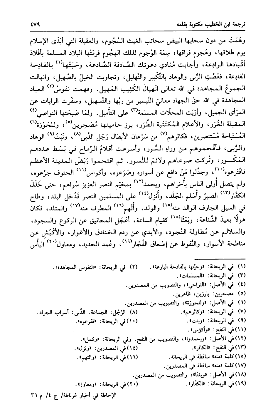 وهمت من دون سحابها البيض سحائب الغيث السّجوم، والعقيلة التي أبدى الإسلام يوم طلاقها، وهجوم فراقها، سمة الوجوم لذلك الهجوم فرمتها البلاد المسلمة بأفلاذ أكبادها الوادعة، وأجابت منادي دعوتك الصّادقة الصّادعة، وحبتها «1» بالفادحة الفادعة، فغصّت الرّبى والوهاد بالتّكبير والتّهليل، وتجاوبت الخيل بالصّهيل، وانهالت الجموع المجاهدة في الله تعالى انهيال الكثيب المهيل. وفهمت نفوس «2» العباد المجاهدة في الله حقّ الجهاد معاني التّيسير من ربّها والتّسهيل، وسفرت الرايات عن المرأى الجميل، وأربت المحلّات المسلمة «3» على التأميل. ولمّا صبحتها النواصي «4» المقبلة الغرر، والأعلام المكتتبة الطّرر، برز حاميتها مصحرين «5» ، وللحوزة «6» المستباحة مستنصرين، فكاثرهم «7» من سرعان الأبطال رجل الدّبى «8» ، ونبت «9» الوهاد والرّبى، فأقحموهم من وراء السّور، وأسرعت أقلام الرّماح في بسط عددهم المكسور، وتركت صرعاهم ولائم للنّسور. ثم اقتحموا ربض المدينة الأعظم فافترعوه «10» ، وجدّلوا من دافع عن أسواره وصرعوه، وأكواس «11» الحتوف جرّعوه، ولم يتصل أولى الناس بأخراهم، ويحمد «12» بمخيّم النصر العزيز سراهم، حتى خذل الكفّار «13» الصبر وأسلم الجلد، وأنزل «14» على المسلمين النصر فدخل البلد، وطاح في السيل الجارف الوالد منه «15» والولد، وأتهم «16» المطرف منه «17» والمتلد، فكان هولا بعيد الشّناعة، وبعثا «18» كقيام الساعة، أعجل المجانيق عن الركوع والسجود، والسلالم عن مطاولة النّجود، والأيدي عن ردم الخنادق والأغوار، والأكبش عن مناطحة الأسوار، والنّفوط عن إصعاق الفجّار «19» ، وعمد الحديد، ومعاول «20» البأس