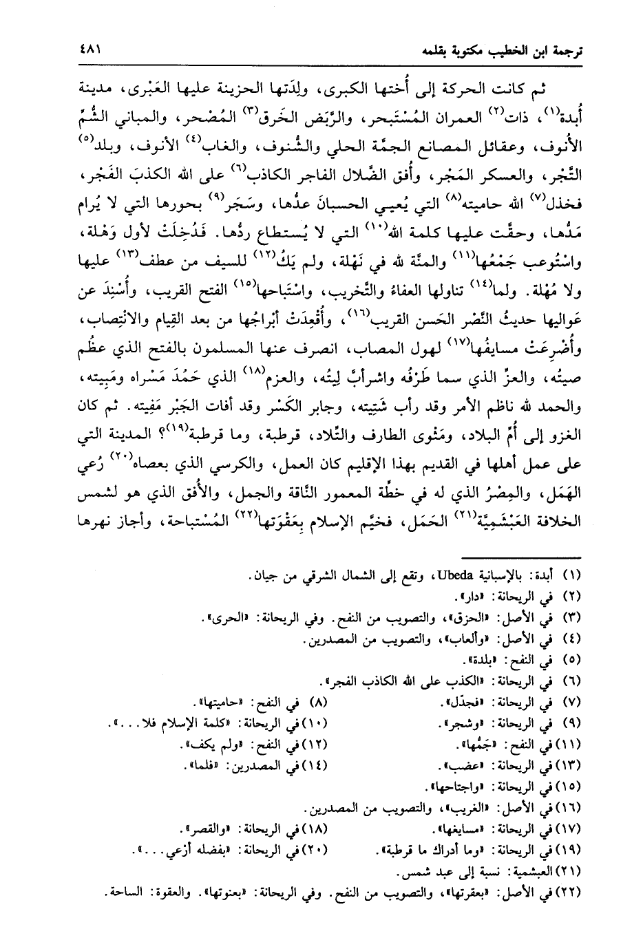ثم كانت الحركة إلى أختها الكبرى، ولدتها الحزينة عليها العبرى، مدينة أبدة «1» ، ذات «2» العمران المستبحر، والرّبض الخرق «3» المصحر، والمباني الشّمّ الأنوف، وعقائل المصانع الجمّة الحلي والشّنوف، والغاب «4» الأنوف، وبلد «5» التّجر، والعسكر المجر، وأفق الضّلال الفاجر الكاذب «6» على الله الكذب الفجر، فخذل «7» الله حاميته «8» التي يعيي الحسبان عدّها، وسجر «9» بحورها التي لا يرام مدّها، وحقّت عليها كلمة الله «10» التي لا يستطاع ردّها. فدخلت لأول وهلة، واستوعب جمعها «11» والمنّة لله في نهلة، ولم يك «12» للسيف من عطف «13» عليها ولا مهلة. ولما «14» تناولها العفاء والتّخريب، واستباحها «15» الفتح القريب، وأسند عن عواليها حديث النّصر الحسن القريب «16» ، وأقعدت أبراجها من بعد القيام والانتصاب، وأضرعت مسايفها «17» لهول المصاب، انصرف عنها المسلمون بالفتح الذي عظم صيته، والعزّ الذي سما طرفه واشرأبّ ليته، والعزم «18» الذي حمد مسراه ومبيته، والحمد لله ناظم الأمر وقد رأب شتيته، وجابر الكسر وقد أفات الجبر مفيته. ثم كان الغزو إلى أمّ البلاد، ومثوى الطارف والتّلاد، قرطبة، وما قرطبة «19» ؟ المدينة التي على عمل أهلها في القديم بهذا الإقليم كان العمل، والكرسي الذي بعصاه «20» رعي الهمل، والمصر الذي له في خطّة المعمور النّاقة والجمل، والأفق الذي هو لشمس الخلافة العبشميّة «21» الحمل، فخيّم الإسلام بعقوتها «22» المستباحة، وأجاز نهرها