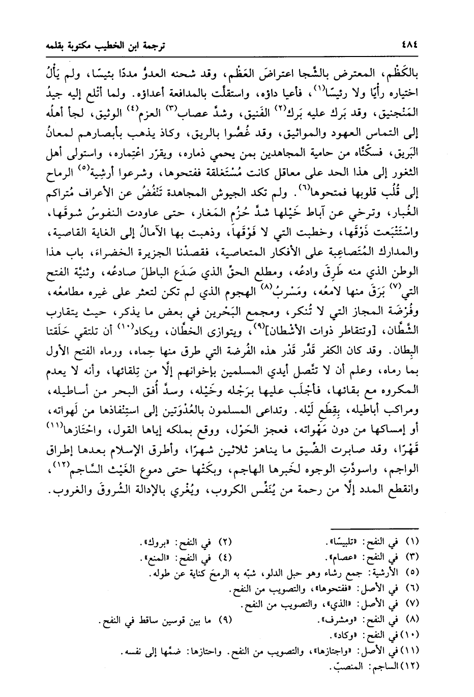 بالكظم، المعترض بالشّجا اعتراض العظم، وقد شحنه العدوّ مددا بئيسا، ولم يأل اختياره رأيّا ولا رئيسا «1» ، فأعيا داؤه، واستقلّت بالمدافعة أعداؤه. ولما أتلع إليه جيد المنجنيق، وقد برك عليه برك «2» الفنيق، وشدّ عصاب «3» العزم «4» الوثيق، لجأ أهله إلى التماس العهود والمواثيق، وقد غصّوا بالريق، وكاذ يذهب بأبصارهم لمعان البريق، فسكّنّاه من حامية المجاهدين بمن يحمي ذماره، ويقرّر اعتماره، واستولى أهل الثغور إلى هذا الحد على معاقل كانت مستغلقة ففتحوها، وشرعوا أرشية «5» الرماح إلى قلب قلوبها فمتحوها «6» . ولم تكد الجيوش المجاهدة تنفض عن الأعراف متراكم الغبار، وترخي عن آباط خيلها شدّ حزم المغار، حتى عاودت النفوس شوقها، واستتبعت ذوقها، وخطبت التي لا فوقها، وذهبت بها الآمال إلى الغاية القاصية، والمدارك المتصاعبة على الأفكار المتعاصية، فقصدنا الجزيرة الخضراء، باب هذا الوطن الذي منه طرق وادعه، ومطلع الحقّ الذي صدع الباطل صادعه، وثنيّة الفتح التي «7» برق منها لامعه، ومسرب «8» الهجوم الذي لم تكن لتعثر على غيره مطامعه، وفرضة المجاز التي لا تنكر، ومجمع البحرين في بعض ما يذكر، حيث يتقارب الشّطّان، [وتتقاطر ذوات الأشطان] «9» ، ويتوازى الخطّان، ويكاد «10» أن تلتقي حلقتا البطان. وقد كان الكفر قدّر قدر هذه الفرضة التي طرق منها حماه، ورماه الفتح الأول بما رماه، وعلم أن لا تتّصل أيدي المسلمين بإخوانهم إلّا من تلقائها، وأنه لا يعدم المكروه مع بقائها، فأجلب عليها برجله وخيله، وسدّ أفق البحر من أساطيله، ومراكب أباطيله، بقطع ليله. وتداعى المسلمون بالعدوتين إلى استنفاذها من لهواته، أو إمساكها من دون مهواته، فعجز الحول، ووقع بملكه إياها القول، واحتازها «11» قهرا، وقد صابرت الضّيق ما يناهز ثلاثين شهرا، وأطرق الإسلام بعدها إطراق الواجم، واسودّت الوجوه لخبرها الهاجم، وبكتها حتى دموع الغيث السّاجم «12» ، وانقطع المدد إلّا من رحمة من ينفّس الكروب، ويغري بالإدالة الشروق والغروب.