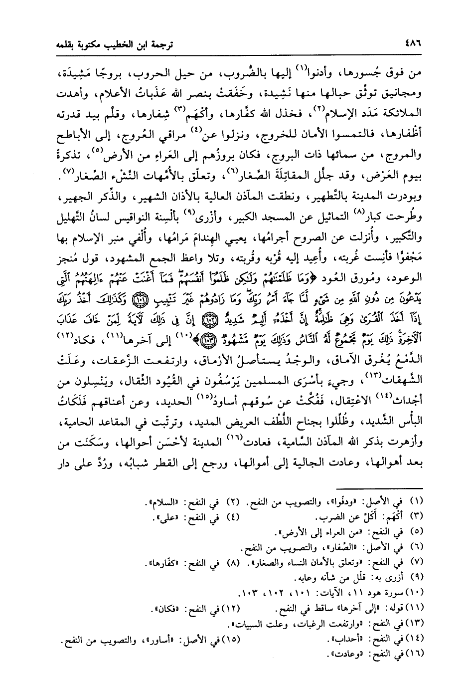 وبودرت المدينة بالتّطهير، ونطقت المآذن العالية بالأذان الشهير، والذّكر الجهير، وطرحت كبار «8» التماثيل عن المسجد الكبير، وأزرى «9» بألسنة النواقيس لسان التّهليل والتّكبير، وأنزلت عن الصروح أجرامها، يعيي الهندام مرامها، وألفي منبر الإسلام بها مجفوّا فأنست غربته، وأعيد إليه قربه وقربته، وتلا واعظ الجمع المشهود، قول منجز الوعود، ومورق العود وَما ظَلَمْناهُمْ وَلكِنْ ظَلَمُوا أَنْفُسَهُمْ فَما أَغْنَتْ عَنْهُمْ آلِهَتُهُمُ الَّتِي يَدْعُونَ مِنْ دُونِ اللَّهِ مِنْ شَيْءٍ لَمَّا جاءَ أَمْرُ رَبِّكَ وَما زادُوهُمْ غَيْرَ تَتْبِيبٍ (101) وَكَذلِكَ أَخْذُ رَبِّكَ إِذا أَخَذَ الْقُرى وَهِيَ ظالِمَةٌ إِنَّ أَخْذَهُ أَلِيمٌ شَدِيدٌ (102) إِنَّ فِي ذلِكَ لَآيَةً لِمَنْ خافَ عَذابَ الْآخِرَةِ ذلِكَ يَوْمٌ مَجْمُوعٌ لَهُ النَّاسُ وَذلِكَ يَوْمٌ مَشْهُودٌ (103)