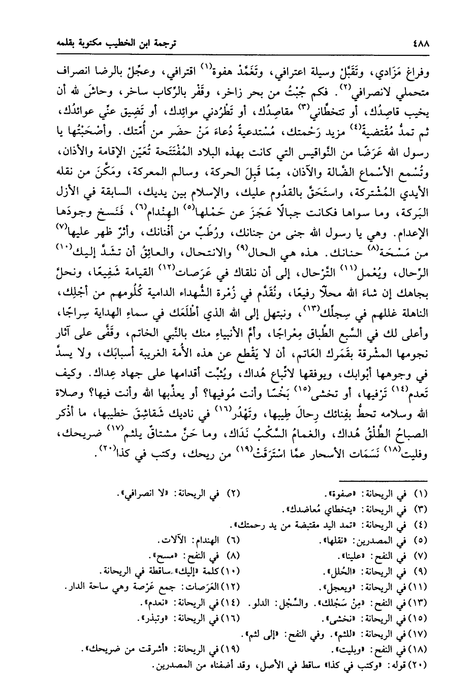 وفراغ مزادي، وتقبّل وسيلة اعترافي، وتغمّد هفوة «1» اقترافي، وعجّل بالرضا انصراف متحملي لانصرافي «2» . فكم جبت من بحر زاخر، وقفر بالرّكاب ساخر، وحاش لله أن يخيب قاصدك، أو تتخطّاني «3» مقاصدك، أو تطردني موائدك، أو تضيق عنّي عوائدك، ثم تمدّ مقتضية «4» مزيد رحمتك، مستدعية دعاء من حضر من أمّتك. وأصحبتها يا رسول الله عرضا من النّواقيس التي كانت بهذه البلاد المفتتحة تعيّن الإقامة والأذان، وتسمع الأسماع الضّالة والآذان، ممّا قبل الحركة، وسالم المعركة، ومكّن من نقله الأيدي المشتركة، واستحقّ بالقدوم عليك، والإسلام بين يديك، السابقة في الأزل البركة، وما سواها فكانت جبالا عجز عن حملها «5» الهندام «6» ، فنسخ وجودها الإعدام. وهي يا رسول الله جنى من جنانك، ورطب من أفنانك، وأثر ظهر عليها «7» من مسحة «8» حنانك. هذه هي الحال «9» والانتحال، والعائق أن تشدّ إليك «10» الرّحال، ويعمل «11» التّرحال، إلى أن نلقاك في عرصات «12» القيامة شفيعا، ونحلّ بجاهك إن شاء الله محلّا رفيعا، ونقدّم في زمرة الشّهداء الدامية كلومهم من أجلك، الناهلة غللهم في سجلّك «13» ، ونبتهل إلى الله الذي أطلعك في سماء الهداية سراجا، وأعلى لك في السّبع الطّباق معراجا، وأمّ الأنبياء منك بالنّبي الخاتم، وقفّى على آثار نجومها المشرقة بقمرك العاتم، أن لا يقطع عن هذه الأمة الغريبة أسبابك، ولا يسدّ في وجوهها أبوابك، ويوفقها لاتّباع هداك، ويثبّت أقدامها على جهاد عداك. وكيف تعدم «14» ترفيها، أو تخشى «15» بخسا وأنت موفيها؟ أو يعذّبها الله وأنت فيها؟ وصلاة الله وسلامه تحطّ بفنائك رحال طيبها، وتهدر «16» في ناديك شقاشق خطيبها، ما أذكر الصباح الطّلق هداك، والغمام السّكب نداك، وما حنّ مشتاق يلثم «17» ضريحك، وفليت «18» نسمات الأسحار عمّا استرقت «19» من ريحك، وكتب في كذا «20» .