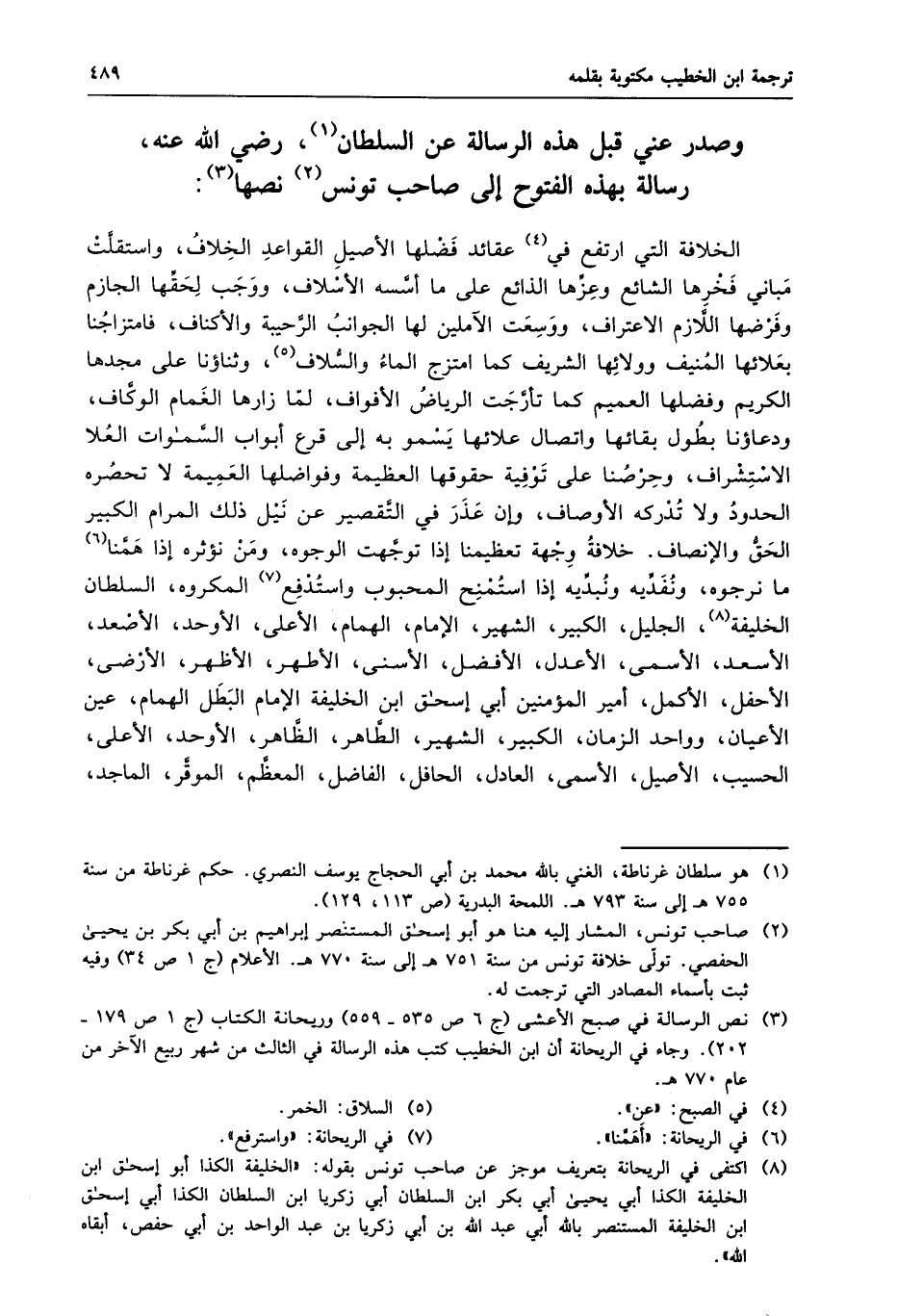 الخلافة التي ارتفع في «4» عقائد فضلها الأصيل القواعد الخلاف، واستقلّت مباني فخرها الشائع وعزّها الذائع على ما أسّسه الأسلاف، ووجب لحقّها الجازم وفرضها اللّازم الاعتراف، ووسعت الآملين لها الجوانب الرّحيبة والأكناف، فامتزاجنا بعلائها المنيف وولائها الشريف كما امتزج الماء والسّلاف «5» ، وثناؤنا على مجدها الكريم وفضلها العميم كما تأرّجت الرياض الأفواف، لمّا زارها الغمام الوكّاف، ودعاؤنا بطول بقائها واتصال علائها يسمو به إلى قرع أبواب السّماوات العلا الاستشراف، وحرصنا على توفية حقوقها العظيمة وفواضلها العميمة لا تحصره الحدود ولا تدركه الأوصاف، وإن عذر في التّقصير عن نيل ذلك المرام الكبير الحقّ والإنصاف. خلافة وجهة تعظيمنا إذا توجّهت الوجوه، ومن نؤثره إذا همّنا «6» ما نرجوه، ونفدّيه ونبدّيه إذا استمنح المحبوب واستدفع «7» المكروه، السلطان الخليفة «8» ، الجليل، الكبير، الشهير، الإمام، الهمام، الأعلى، الأوحد، الأصعد، الأسعد، الأسمى، الأعدل، الأفضل، الأسنى، الأطهر، الأظهر، الأرضى، الأحفل، الأكمل، أمير المؤمنين أبي إسحاق ابن الخليفة الإمام البطل الهمام، عين الأعيان، وواحد الزمان، الكبير، الشهير، الطّاهر، الظّاهر، الأوحد، الأعلى، الحسيب، الأصيل، الأسمى، العادل، الحافل، الفاضل، المعظّم، الموقّر، الماجد،