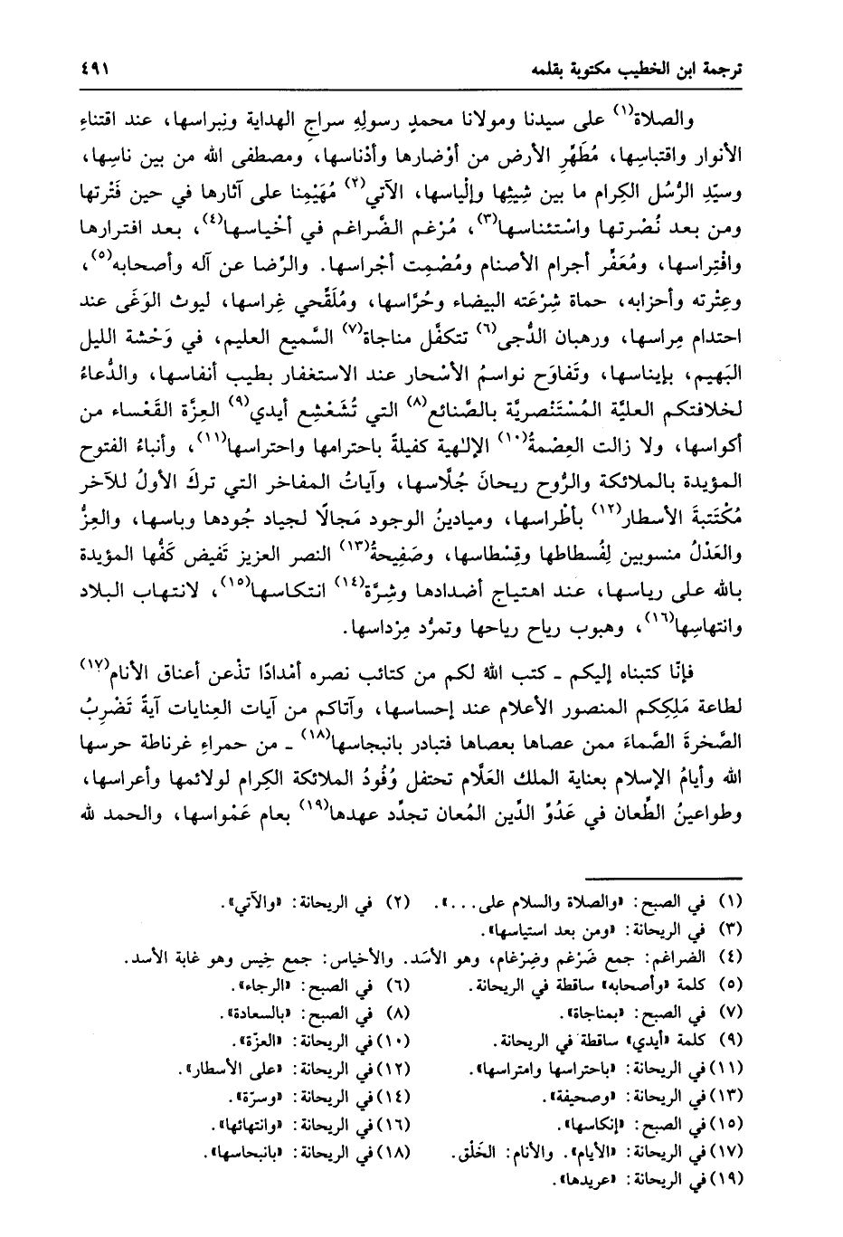 فإنّا كتبناه إليكم- كتب الله لكم من كتائب نصره أمدادا تذعن أعناق الأنام «17» لطاعة ملككم المنصور الأعلام عند إحساسها، وآتاكم من آيات العنايات آية تضرب الصّخرة الصّماء ممن عصاها بعصاها فتبادر بانبجاسها «18» - من حمراء غرناطة حرسها الله وأيام الإسلام بعناية الملك العلّام تحتفل وفود الملائكة الكرام لو لائمها وأعراسها، وطواعين الطّعان في عدوّ الدّين المعان تجدّد عهدها «19» بعام عمواسها، والحمد لله