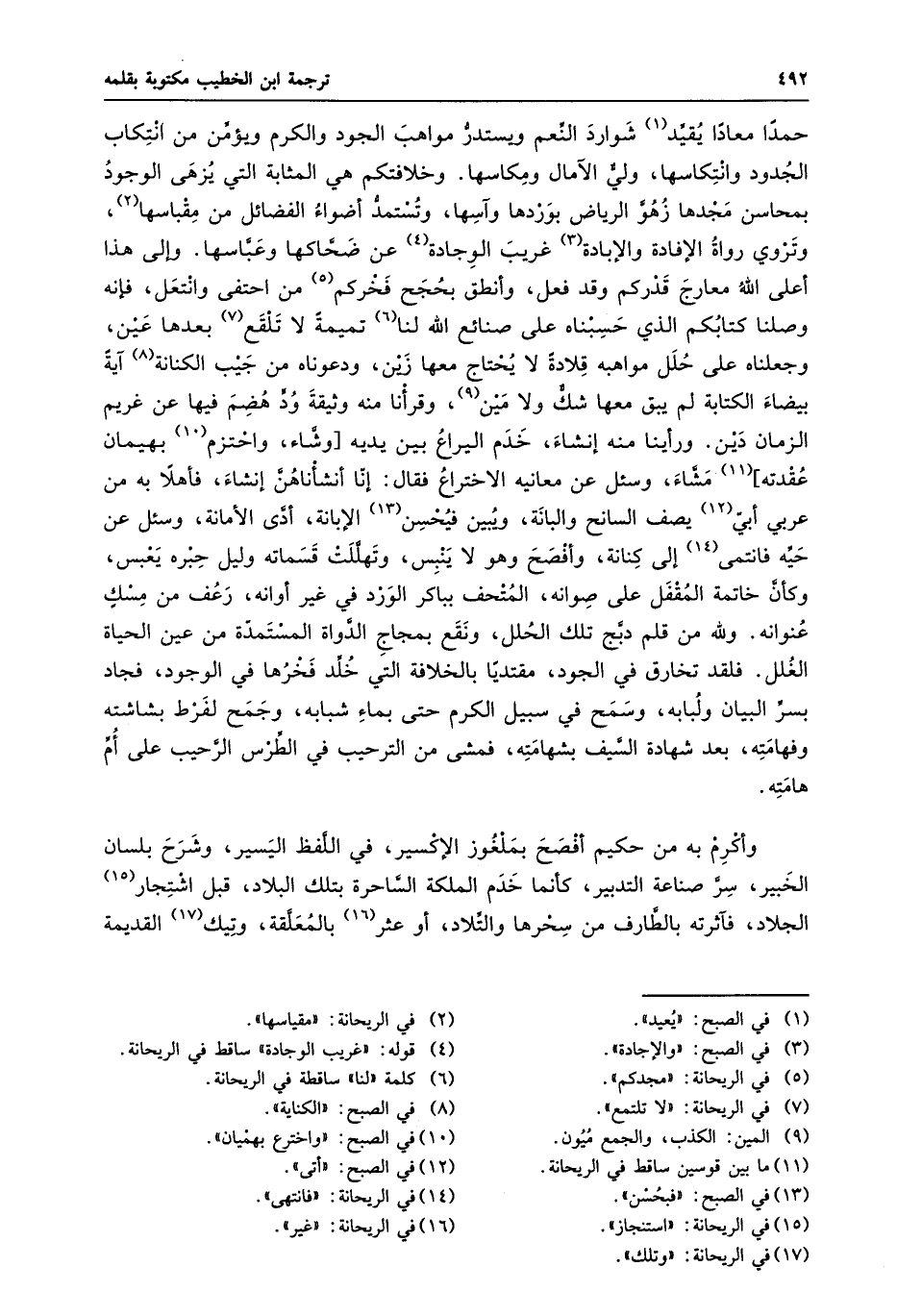 حمدا معادا يقيّد «1» شوارد النّعم ويستدرّ مواهب الجود والكرم ويؤمّن من انتكاب الجدود وانتكاسها، وليّ الآمال ومكاسها. وخلافتكم هي المثابة التي يزهى الوجود بمحاسن مجدها زهوّ الرياض بوردها وآسها، وتستمدّ أضواء الفضائل من مقباسها «2» ، وتروي رواة الإفادة والإبادة «3» غريب الوجادة «4» عن ضحّاكها وعبّاسها. وإلى هذا أعلى الله معارج قدركم وقد فعل، وأنطق بحجح فخركم «5» من احتفى وانتعل، فإنه وصلنا كتابكم الذي حسبناه على صنائع الله لنا «6» تميمة لا تلقع «7» بعدها عين، وجعلناه على حلل مواهبه قلادة لا يحتاج معها زين، ودعوناه من جيب الكنانة «8» آية بيضاء الكتابة لم يبق معها شكّ ولا مين «9» ، وقرأنا منه وثيقة ودّ هضم فيها عن غريم الزمان دين. ورأينا منه إنشاء، خدم اليراع بين يديه [وشّاء، واحتزم «10» بهيمان عقدته] «11» مشّاء، وسئل عن معانيه الاختراع فقال: إنّا أنشأناهنّ إنشاء، فأهلا به من عربي أبيّ «12» يصف السانح والبانة، ويبين فيحسن «13» الإبانة، أدّى الأمانة، وسئل عن حيّه فانتمى «14» إلى كنانة، وأفصح وهو لا ينبس، وتهلّلت قسماته وليل حبره يعبس، وكأنّ خاتمة المقفل على صوانه، المتحف بباكر الورد في غير أوانه، رعف من مسك عنوانه. ولله من قلم دبّج تلك الحلل، ونقع بمجاج الدّواة المستمدّة من عين الحياة الغلل. فلقد تخارق في الجود، مقتديا بالخلافة التي خلّد فخرها في الوجود، فجاد بسرّ البيان ولبابه، وسمح في سبيل الكرم حتى بماء شبابه، وجمح لفرط بشاشته وفهامته، بعد شهادة السّيف بشهامته، فمشى من الترحيب في الطّرس الرّحيب على أمّ هامته.