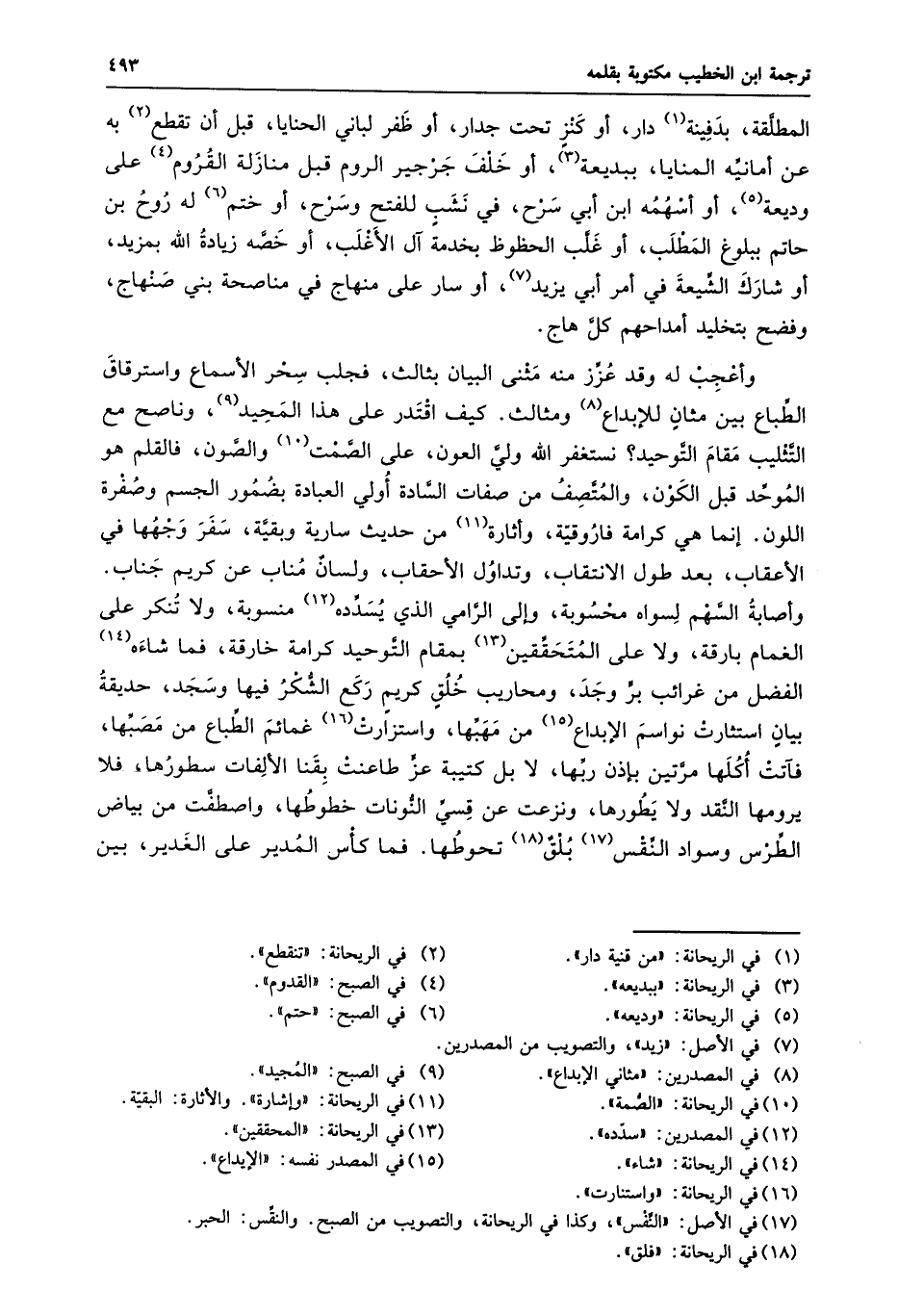 وأعجب له وقد عزّز منه مثنى البيان بثالث، فجلب سحر الأسماع واسترقاق الطّباع بين مثان للإبداع «8» ومثالث. كيف اقتدر على هذا المحيد «9» ، وناصح مع التّثليب مقام التّوحيد؟ نستغفر الله وليّ العون، على الصّمت «10» والصّون، فالقلم هو الموحّد قبل الكون، والمتّصف من صفات السّادة أولي العبادة بضمور الجسم وصفرة اللون. إنما هي كرامة فاروقيّة، وأثارة «11» من حديث سارية وبقيّة، سفر وجهها في الأعقاب، بعد طول الانتقاب، وتداول الأحقاب، ولسان مناب عن كريم جناب.