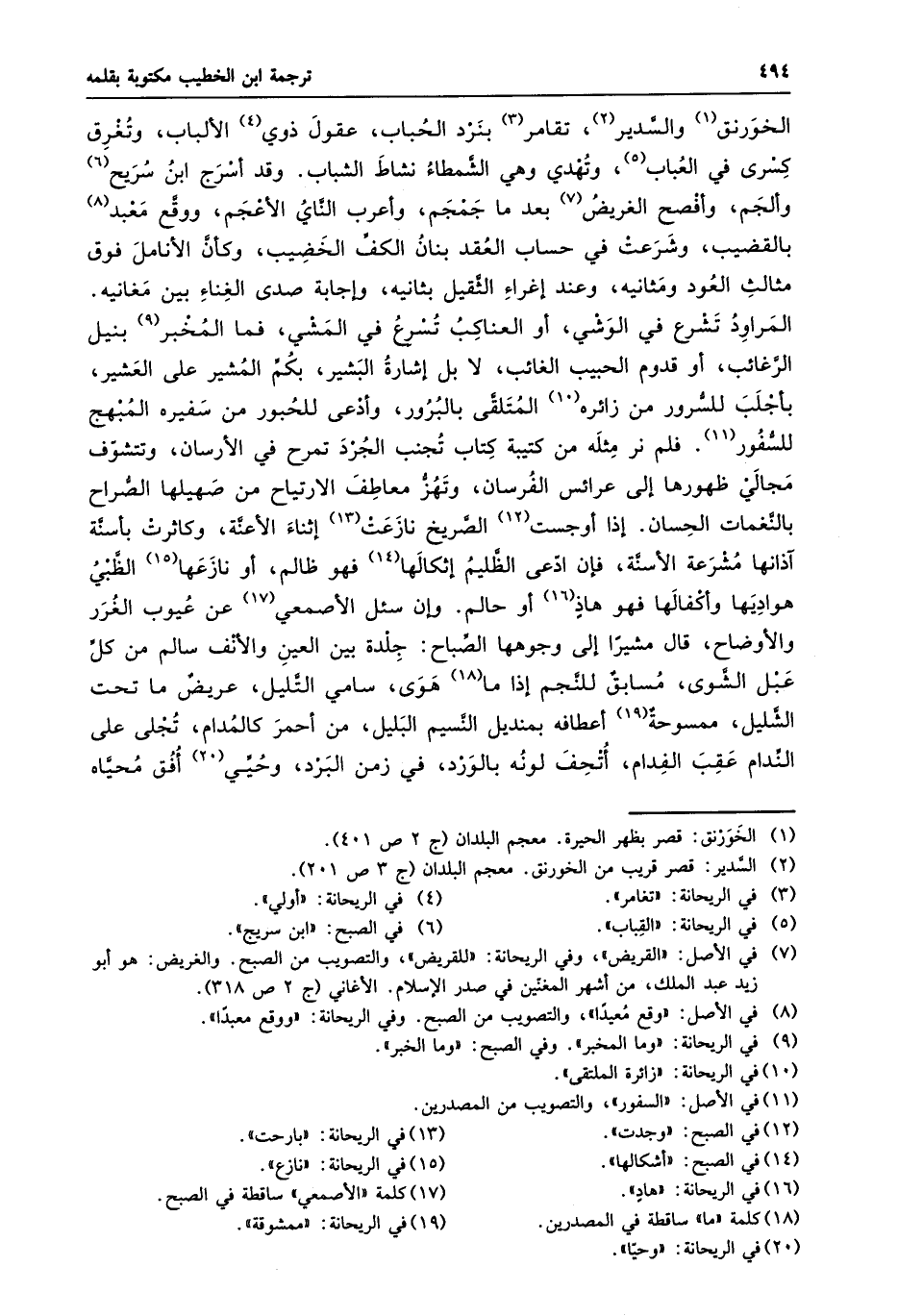 الخورنق «1» والسّدير «2» ، تقامر «3» بنرد الحباب، عقول ذوي «4» الألباب، وتغرق كسرى في العباب «5» ، وتهدي وهي الشّمطاء نشاط الشباب. وقد أسرج ابن سريح «6» وألجم، وأفصح الغريض «7» بعد ما جمجم، وأعرب النّاي الأعجم، ووقّع معبد «8» بالقضيب، وشرعت في حساب العقد بنان الكفّ الخضيب، وكأنّ الأنامل فوق مثالث العود ومثانيه، وعند إغراء الثّقيل بثانيه، وإجابة صدى الغناء بين مغانيه.