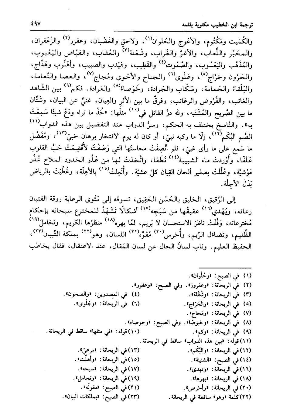 إلى الرّقيق، الخليق بالحسن الحقيق، تسوقه إلى مثوى الرعاية روقة الفتيان رعاته، ويهدي «16» عقيقها من سبجه «17» أشكالا تشهد للمخترع سبحانه بإحكام مخترعاته، وقّفت ناظر الاستحسان لا يريم، لمّا بهره «18» منظرها الكريم، وتخامل «19» الظّليم، وتضاءل الرّيم، وأخرس «20» مفوّه «21» اللسان، وهو «22» بملكة التّبيان «23» ، الحفيظ العليم. وناب لسان الحال عن لسان المقال، عند الاعتقال، فقال يخاطب