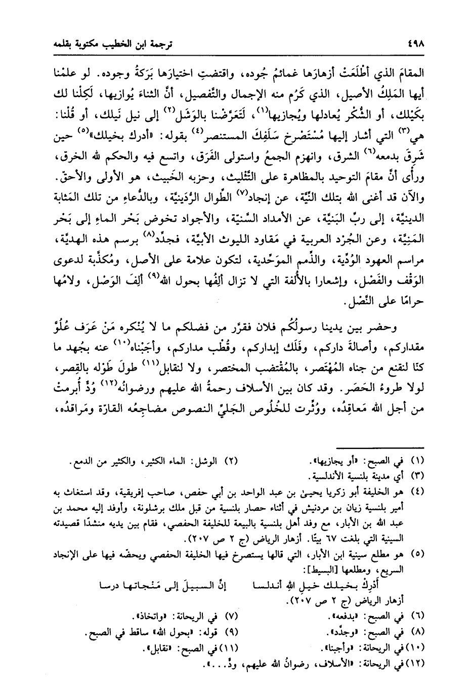 والآن قد أغنى الله بتلك النّيّة، عن إنجاد «7» الطّوال الرّدينيّة، وبالدّعاء من تلك المثابة الدينيّة، إلى ربّ البنيّة، عن الأمداد السّنيّة، والأجواد تخوض بحر الماء إلى بحر المنيّة، وعن الجرد العربية في مقاود الليوث الأبيّة، فجدّد «8» برسم هذه الهديّة، مراسم العهود الودّية، والذّمم الموحّدية، لتكون علامة على الأصل، ومكذّبة لدعوى الوقف والفصل، وإشعارا بالألفة التي لا تزال ألفها بحول الله «9» ألف الوصل، ولامها حراما على النّصل.