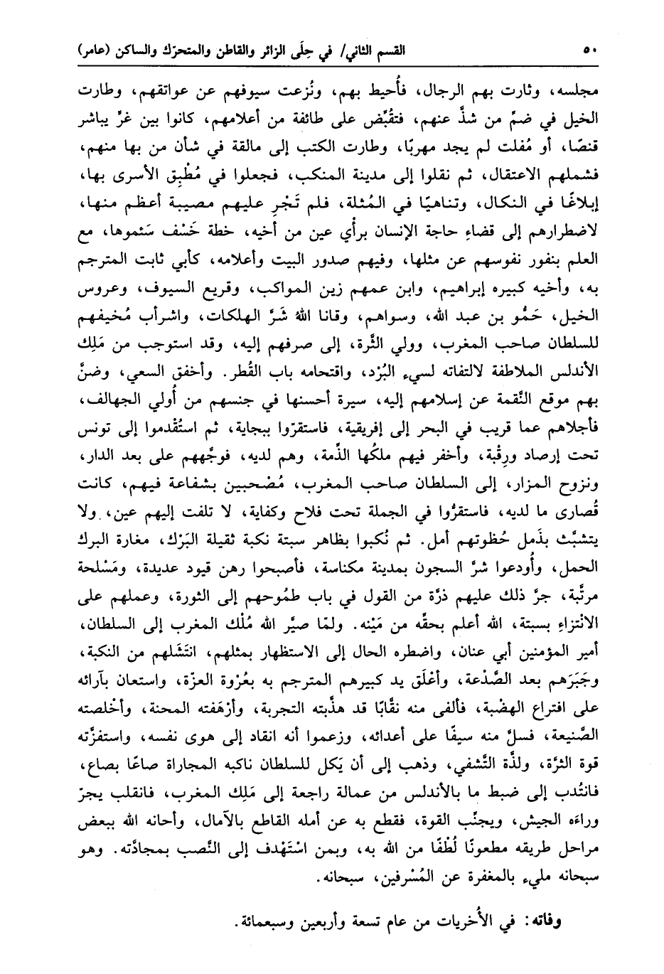 مجلسه، وثارت بهم الرجال، فأحيط بهم، ونزعت سيوفهم عن عواتقهم، وطارت الخيل في ضمّ من شذّ عنهم، فتقبّض على طائفة من أعلامهم، كانوا بين غرّ يباشر قنصا، أو مفلت لم يجد مهربا، وطارت الكتب إلى مالقة في شأن من بها منهم، فشملهم الاعتقال، ثم نقلوا إلى مدينة المنكب، فجعلوا في مطبق الأسرى بها، إبلاغا في النكال، وتناهيا في المثلة، فلم تجر عليهم مصيبة أعظم منها، لاضطرارهم إلى قضاء حاجة الإنسان برأي عين من أخيه، خطة خسف سئموها، مع العلم بنفور نفوسهم عن مثلها، وفيهم صدور البيت وأعلامه، كأبي ثابت المترجم به، وأخيه كبيره إبراهيم، وابن عمهم زين المواكب، وقريع السيوف، وعروس الخيل، حمّو بن عبد الله، وسواهم، وقانا الله شرّ الهلكات، واشرأب مخيفهم للسلطان صاحب المغرب، وولي الثّرة، إلى صرفهم إليه، وقد استوجب من ملك الأندلس الملاطفة لالتفاته لسيء البرد، واقتحامه باب القطر. وأخفق السعي، وضنّ بهم موقع النّقمة عن إسلامهم إليه، سيرة أحسنها في جنسهم من أولي الجهالف، فأجلاهم عما قريب في البحر إلى إفريقية، فاستقرّوا ببجاية، ثم استقدموا إلى تونس تحت إرصاد ورقبة، وأخفر فيهم ملكها الذّمة، وهم لديه، فوجّههم على بعد الدار، ونزوح المزار، إلى السلطان صاحب المغرب، مصحبين بشفاعة فيهم، كانت قصارى ما لديه، فاستقرّوا في الجملة تحت فلاح وكفاية، لا تلفت إليهم عين، ولا يتشبّث بذمل حظوتهم أمل. ثم نكبوا بظاهر سبتة نكبة ثقيلة البرك، مغارة البرك الحمل، وأودعوا شرّ السجون بمدينة مكناسة، فأصبحوا رهن قيود عديدة، ومسلحة مرتّبة، جرّ ذلك عليهم ذرّة من القول في باب طموحهم إلى الثورة، وعملهم على الانتزاء بسبتة، الله أعلم بحقّه من مينه. ولمّا صيّر الله ملك المغرب إلى السلطان، أمير المؤمنين أبي عنان، واضطره الحال إلى الاستظهار بمثلهم، انتشلهم من النكبة، وجبرهم بعد الصّدعة، وأعلق يد كبيرهم المترجم به بعروة العزّة، واستعان بآرائه على افتراع الهضبة، فألفى منه نقّابا قد هذّبته التجربة، وأرهفته المحنة، وأخلصته الصّنيعة، فسلّ منه سيفا على أعدائه، وزعموا أنه انقاد إلى هوى نفسه، واستفزّته قوة الثرّة، ولذّة التّشفي، وذهب إلى أن يكل للسلطان ناكبه المجاراة صاعا بصاع، فانتدب إلى ضبط ما بالأندلس من عمالة راجعة إلى ملك المغرب، فانقلب يجرّ وراءه الجيش، ويجنّب القوة، فقطع به عن أمله القاطع بالآمال، وأحانه الله ببعض مراحل طريقه مطعونا لطفا من الله به، وبمن استهدف إلى النّصب بمجادّته. وهو سبحانه مليء بالمغفرة عن المسرفين، سبحانه.