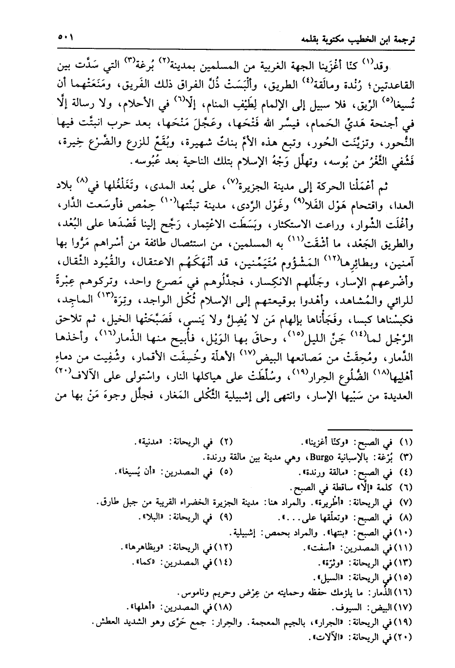 وقد «1» كنّا أغزينا الجهة الغربية من المسلمين بمدينة «2» برغة «3» التي سدّت بين القاعدتين؛ رندة ومالقة «4» الطريق، وألبست ذلّ الفراق ذلك الفريق، ومنعتهما أن تسيغا «5» الرّيق، فلا سبيل إلى الإلمام لطيف المنام، إلّا «6» في الأحلام، ولا رسالة إلّا في أجنحة هديّ الحمام، فيسّر الله فتحها، وعجّل منحها، بعد حرب انبتّت فيها النّحور، وتزيّنت الحور، وتبع هذه الأمّ بنات شهيرة، وبقع للزرع والضّرع خيرة، فشفي الثّغر من بوسه، وتهلّل وجه الإسلام بتلك الناحية بعد عبوسه.