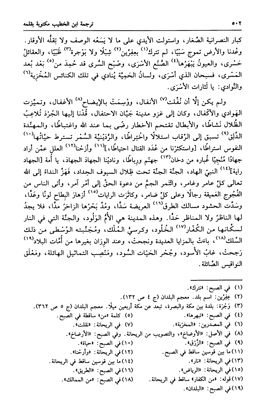 ولم يكن إلّا أن نفّلت «7» الأنفال، ووسمت بالإيضاح «8» الأغفال، وتميّزت الهوادي والأكفال، وكان إلى غزو مدينة جيّان الاحتفال، قدنا إليها الجرد تلاعب الظّلال نشاطا، والأبطال تقتحم الأخطار رضى بما عند الله واغتباطا، والمهنّدة الدّلق «9» تسبق إلى الرّقاب استلالا واختراطا، والرّدينيّة السّمر تسترط حيّاتها «10» النفوس استراطا، [واستكثرنا من عدد القتال احتياطا،] «11» وأزحنا «12» العلل عمّن أراد جهادا منجيا غباره من دخان «13» جهنّم ورباطا، ونادينا الجهاد الجهاد، يا أمة [الجهاد راية] «14» النبيّ الهاد، الجنّة الجنّة تحت ظلال السيوف الحداد، فهزّ النداء إلى الله تعالى كلّ عامر وغامر، وائتمر الجمّ من دعوة الحقّ إلى أمر آمر، وأتى الناس من الفجوج العميقة رجالا وعلى كلّ ضامر، وكاثرت الرايات «15» أزهار البطاح لونا وعدّا، وسدّت الحشود مسالك الطرق «16» العريضة سدّا، ومدّ بحرها الزاخر مدّا، فلا يجد لها الناظر ولا المناظر حدّا. وهذه المدينة هي الأمّ الولود، والجنّة التي في النار لسكّانها من الكفّار «17» الخلود، وكرسيّ الملك، ومجنّبته الوسطى من ذلك السّلك «18» ، باءت بالمزايا العديدة ونجحت، وعند الوزان بغيرها من أمّات البلاد «19» رجحت، غاب الأسود، وجحر الحيّات السّود، ومنصب التماثيل الهائلة، ومعلق النواقيس الصّائلة.