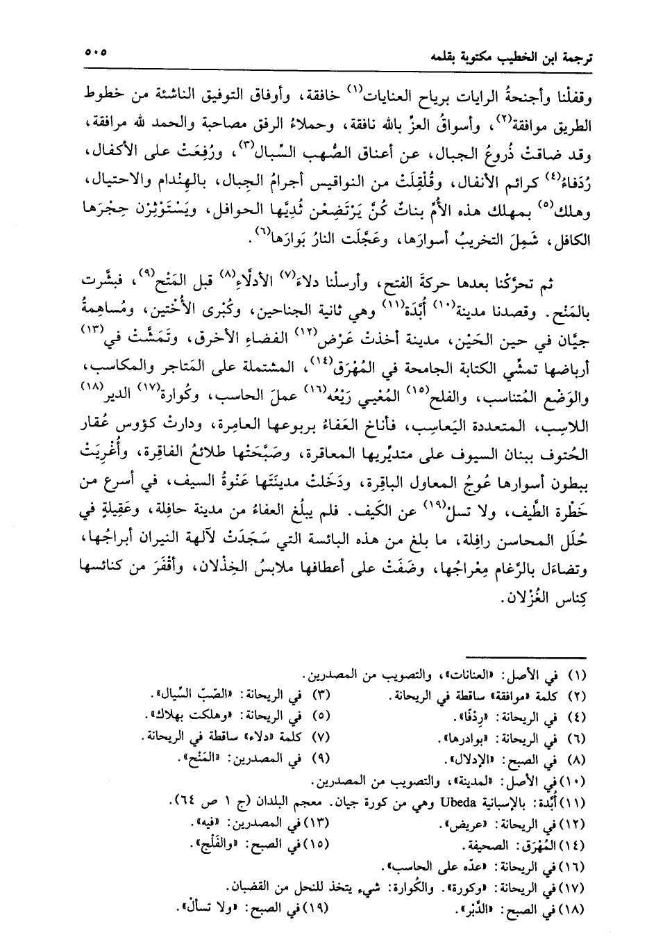 الأدلّاء «8» قبل المتح «9» ، فبشّرت بالمنح. وقصدنا مدينة «10» أبّدة «11» وهي ثانية الجناحين، وكبرى الأختين، ومساهمة جيّان في حين الحين، مدينة أخذت عرض «12» الفضاء الأخرق، وتمشّت في «13» أرباضها تمشّي الكتابة الجامحة في المهرق «14» ، المشتملة على المتاجر والمكاسب، والوضع المتناسب، والفلح «15» المعيي ريعه «16» عمل الحاسب، وكوارة «17» الدير «18» اللاسب، المتعددة اليعاسب، فأناخ العفاء بربوعها العامرة، ودارت كؤوس عقار الحتوف ببنان السيوف على متديّريها المعاقرة، وصبّحتها طلائع الفاقرة، وأغريت ببطون أسوارها عوج المعاول الباقرة، ودخلت مدينتها عنوة السيف، في أسرع من خطرة الطّيف، ولا تسل «19» عن الكيف. فلم يبلغ العفاء من مدينة حافلة، وعقيلة في حلل المحاسن رافلة، ما بلغ من هذه البائسة التي سجدت لآلهة النيران أبراجها، وتضاءل بالرّغام معراجها، وضفت على أعطافها ملابس الخذلان، وأقفر من كنائسها كناس الغزلان.