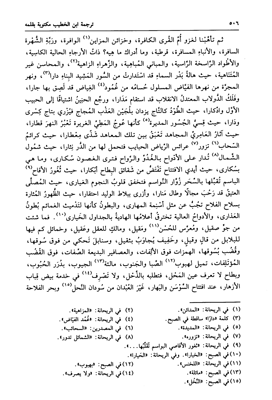 ثم تأهّبنا لغزو أمّ القرى الكافرة، وخزائن المزاين «1» الوافرة، وربّة الشّهرة السافرة، والأنباء المسافرة، قرطبة، وما أدراك ما هيه؟ ذات الأرجاء الحالية الكاسية، والأطواد الرّاسخة الرّاسية، والمباني المباهية، والزّهراء الزاهية «2» ، والمحاسن غير المتناهية، حيث هالة بدر السماء قد استدارت من السّور المشيد البناء دارا «3» ، ونهر المجرّة من نهرها الفيّاض المسلول حسامه من غمود «4» الغياض قد لصق بها جارا، وفلك الدّولاب المعتدل الانقلاب قد استقام مدارا، ورجّع الحنين اشتياقا إلى الحبيب الأوّل وادّكارا، حيث الطّود كالتّاج يزدان بلجين العذب المجاج فيزري بتاج كسرى ودارا، حيث قسيّ الجسور المديرة «5» كأنها عوج المطيّ الغريرة تعبر النهر قطارا، حيث آثار العامريّ المجاهد تعبق بين تلك المعاهد شذى معطارا، حيث كرائم السّحاب «6» تزور «7» عرائس الرّياض الحبايب فتحمل لها من الدّر نثارا، حيث شمول الشّمال «8» تدار على الأدواح بالغدوّ والرّواح فترى الغصون سكارى، وما هي بسكارى، حيث أيدي الافتتاح تفتضّ من شقائق البطاح أبكارا، حيث ثغور الأقاح «9» الباسم تقبّلها بالسّحر زوّار النّواسم فتخفق قلوب النجوم الغيارى، حيث المصلّى العتيق قد رحب مجالا وطال منارا، وأزرى ببلاط الوليد احتقارا، حيث الظّهور المثارة بسلاح الفلاح تجبّ عن مثل أسنمة المهارى، والبطون كأنها لتدميث الغمائم بطون العذارى، والأدواح العالية تخترق أعلامها الهادية بالجداول الخيارى «10» . فما شئت من جوّ صقيل، ومعرّس للحسن «11» ومقيل، ومالك للعقل وعقيل، وخمائل كم فيها للبلابل من قال وقيل، وخفيف يجاوب بثقيل، وسنابل تحكي من فوق سوقها، وقضب بسوقها، الهمزات فوق الألفات، والعصافير البديعة الصّفات، فوق القضب المؤتلفات، تميل لهبوب «12» الصّبا والجنوب، مالئة «13» الجيوب، بدرر الحبوب، وبطاح لا تعرف عين المحل، فتطلبه بالذّحل، ولا تصرف «14» في خدمة بيض قباب الأزهار، عند افتتاح السّوسن والبهار، غير العبدان من سودان النّحل «15» وبحر الفلاحة