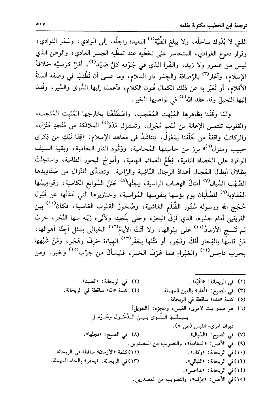 ولمّا وقفنا بظاهرها المبهت المعجب، واصطففنا بخارجها المنبت المنجب، والقلوب تلتمس الإعانة من منعم مجزل، وتستنزل مدد «5» الملائكة من منجد منزل، والركائب واقفة من خلفنا بمعزل، تتناشد في معاهد الإسلام: «قفا نبك من ذكرى حبيب ومنزل «6» » برز من حاميتها المحامية، ووقود النار الحامية، وبقية السيف الوافرة على الحصاد النامية، قطع الغمائم الهامية، وأمواج البحور الطامية، واستجنّت بظلال أبطال المجال أعداد الرجال النّاشبة والرّامية. وتصدّى للنّزال من صناديدها الصّهب السّيال «7» أمثال الهضاب الراسية، يجنّها «8» جنن السّوابغ الكاسية، وقواميسها المفادية «9» للصّلبان يوم بؤسها بنفوسها المواسية، وخنازيرها التي عدتها عن قبول حجج الله ورسوله ستور الظّلم الغاشية، وصخور القلوب القاسية، فكان «10» بين الفريقين أمام جسرها الذي فرق البحر، وحلي بلجينه ولآلىء زينه منها النّحر، حرب لم تنسج الأزمان «11» على منوالها، ولا أتت الأيام «12» الحبالى بمثل أجنّة أهوالها، من قاسها بالفجار أفك وفجر، أو مثّلها بجفر «13» الهباءة خرف وهجر، ومن شبّهها بحرب داحس «14» والغبراء فما عرف الخبر، فليسأل من جرّب «15» وخبر. ومن