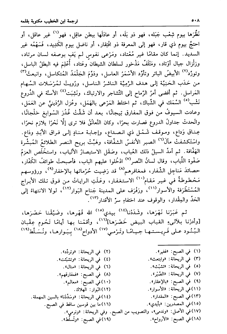 واستكشفت مآل «6» الصبر الأنفس الشفّافة، وهبّت بريح النصر الطلائع المبشّرة الهفّافة. ثم أمدّ السيل ذلك العباب، وصقل الاستبصار الألباب، واستخلص العزم صفوة اللّباب، وقال لسان النّصر «7» ادخلوا عليهم الباب، فأصبحت طوائف الكفّار، حصائد مناجل الشّفار، فمغافرهم «8» قد رضيت حرماتها بالإخفار «9» ، ورؤوسهم محطوطة في غير مقام «10» الاستغفار، وعلت الرايات من فوق تلك الأبراج المستطرفة والأسوار «11» ، ورفرف على المدينة جناح البوار «12» ، لولا الانتهاء إلى الحدّ والمقدار، والوقوف عند اختفاء سرّ الأقدار «13» .