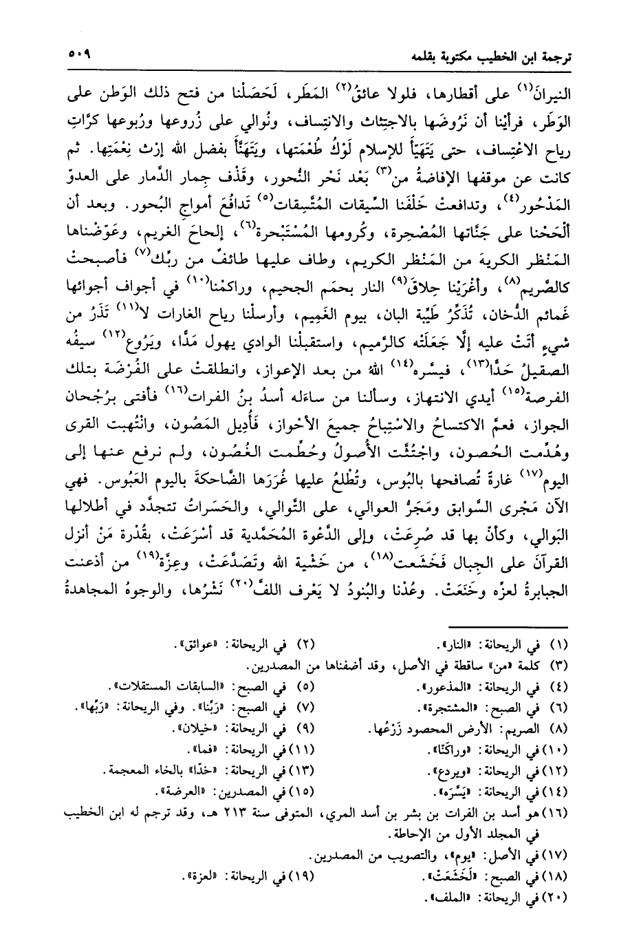 النيران «1» على أقطارها، فلولا عائق «2» المطر، لحصلنا من فتح ذلك الوطن على الوطر، فرأينا أن نروضها بالاجتثاث والانتساف، ونوالي على زروعها وربوعها كرّات رياح الاعتساف، حتى يتهيّأ للإسلام لوك طعمتها، ويتهنّأ بفضل الله إرث نعمتها. ثم كانت عن موقفها الإفاضة من «3» بعد نحر النّحور، وقذف جمار الدّمار على العدوّ المدحور «4» ، وتدافعت خلفنا السّيقات المتّسقات «5» تدافع أمواج البحور. وبعد أن ألححنا على جنّاتها المصحرة، وكرومها المستبحرة «6» ، إلحاح الغريم، وعوّضناها المنظر الكريه من المنظر الكريم، وطاف عليها طائف من ربّك «7» فأصبحت كالصّريم «8» ، وأغرينا حلاق «9» النار بحمم الجحيم، وراكمنا «10» في أجواف أجوائها غمائم الدّخان، تذكّر طيّبة البان، بيوم الغميم، وأرسلنا رياح الغارات لا «11» تذر من شيء أتت عليه إلّا جعلته كالرّميم، واستقبلنا الوادي يهول مدّا، ويروع «12» سيفه الصقيل حدّا «13» ، فيسّره «14» الله من بعد الإعواز، وانطلقت على الفرضة بتلك الفرصة «15» أيدي الانتهاز، وسألنا من ساءله أسد بن الفرات «16» فأفتى برجحان الجواز، فعمّ الاكتساح والاستباح جميع الأحواز، فأديل المصون، وانتهبت القرى وهدّمت الحصون، واجتثّت الأصول وحطّمت الغصون، ولم نرفع عنها إلى اليوم «17» غارة تصافحها بالبوس، وتطلع عليها غررها الضّاحكة باليوم العبوس. فهي الآن مجرى السّوابق ومجرّ العوالي، على التّوالي، والحسرات تتجدّد في أطلالها البوالي، وكأنّ بها قد صرعت، وإلى الدّعوة المحمّدية قد أسرعت، بقدرة من أنزل القرآن على الجبال فخشعت «18» ، من خشية الله وتصدّعت، وعزّة «19» من أذعنت الجبابرة لعزّه وخنعت. وعدنا والبنود لا يعرف اللفّ «20» نشرها، والوجوه المجاهدة