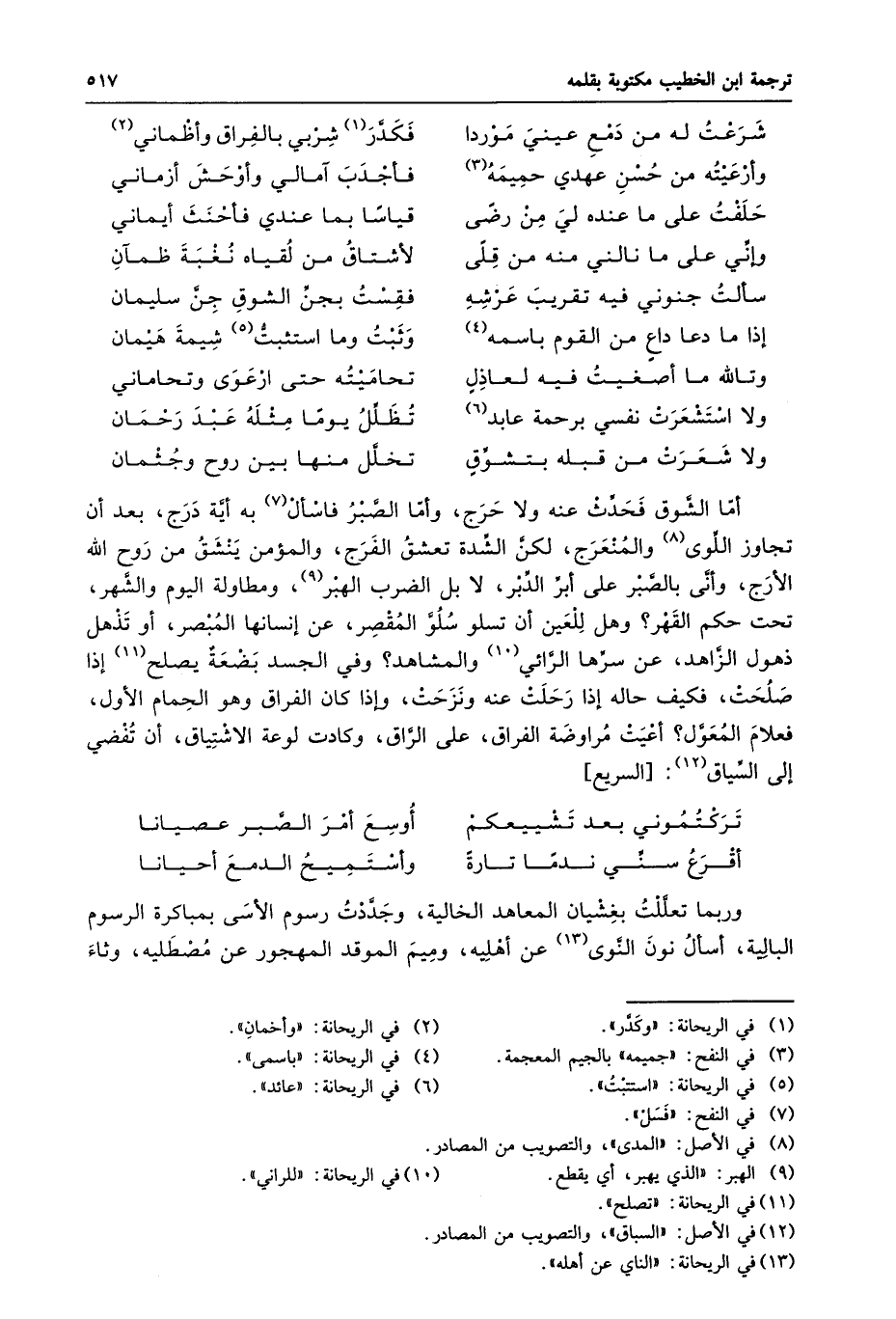 أمّا الشّوق فحدّث عنه ولا حرج، وأمّا الصّبر فاسأل «7» به أيّة درج، بعد أن تجاوز اللّوى «8» والمنعرج، لكنّ الشّدة تعشق الفرج، والمؤمن ينشق من روح الله الأرج، وأنّى بالصّبر على أبرّ الدّبر، لا بل الضرب الهبر «9» ، ومطاولة اليوم والشّهر، تحت حكم القهر؟ وهل للعين أن تسلو سلوّ المقصر، عن إنسانها المبصر، أو تذهل ذهول الزّاهد، عن سرّها الرّائي «10» والمشاهد؟ وفي الجسد بضعة يصلح «11» إذا صلحت، فكيف حاله إذا رحلت عنه ونزحت، وإذا كان الفراق وهو الحمام الأول، فعلام المعوّل؟ أعيت مراوضة الفراق، على الرّاق، وكادت لوعة الاشتياق، أن تفضي إلى السّياق «12» : [السريع]