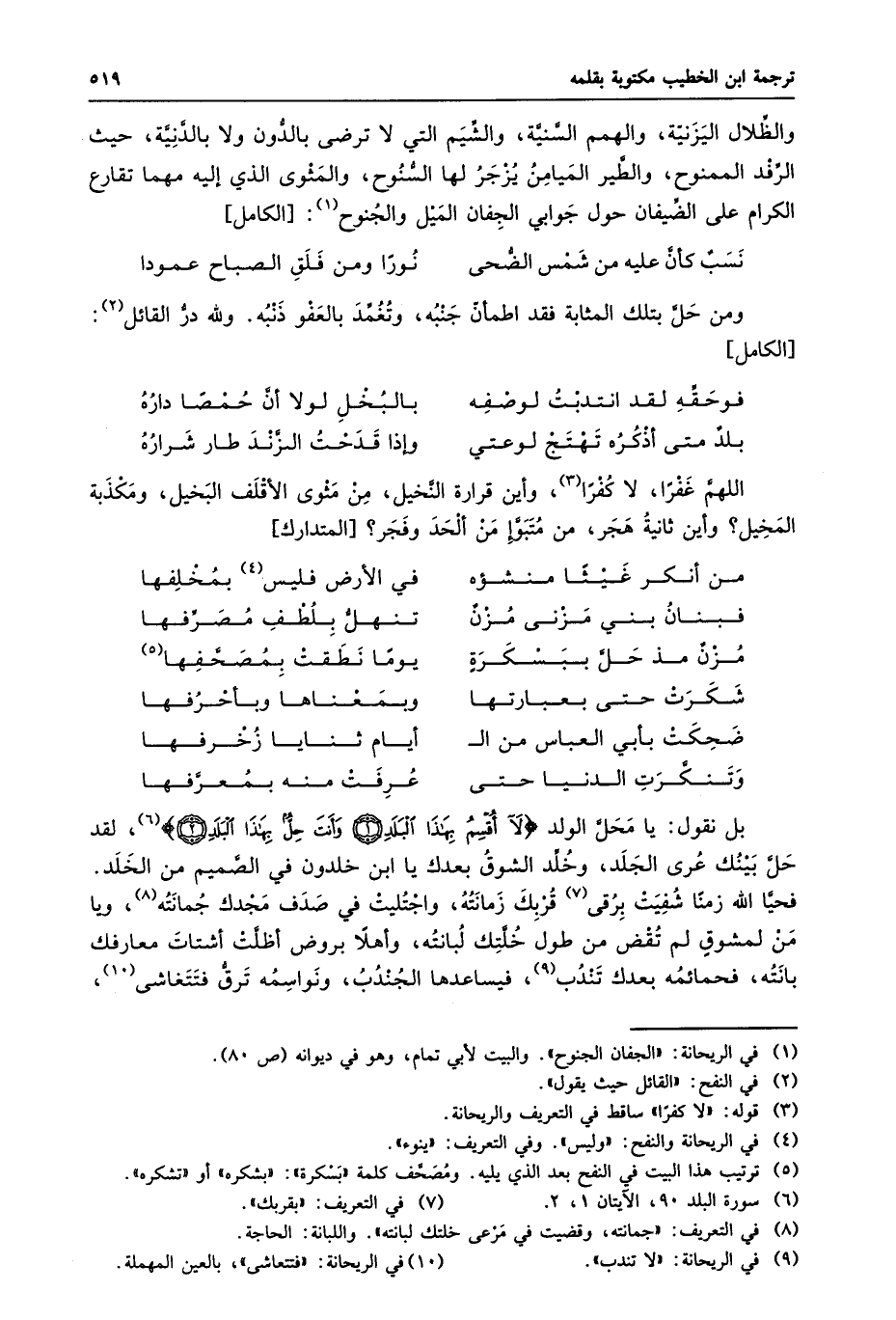 فحيّا الله زمنا شفيت برقى «7» قربك زمانته، واجتليت في صدف مجدك جمانته «8» ، ويا من لمشوق لم تقض من طول خلّتك لبانته، وأهلا بروض أظلّت أشتات معارفك بانته، فحمائمه بعدك تندب «9» ، فيساعدها الجندب، ونواسمه ترقّ فتتغاشى «10» ،