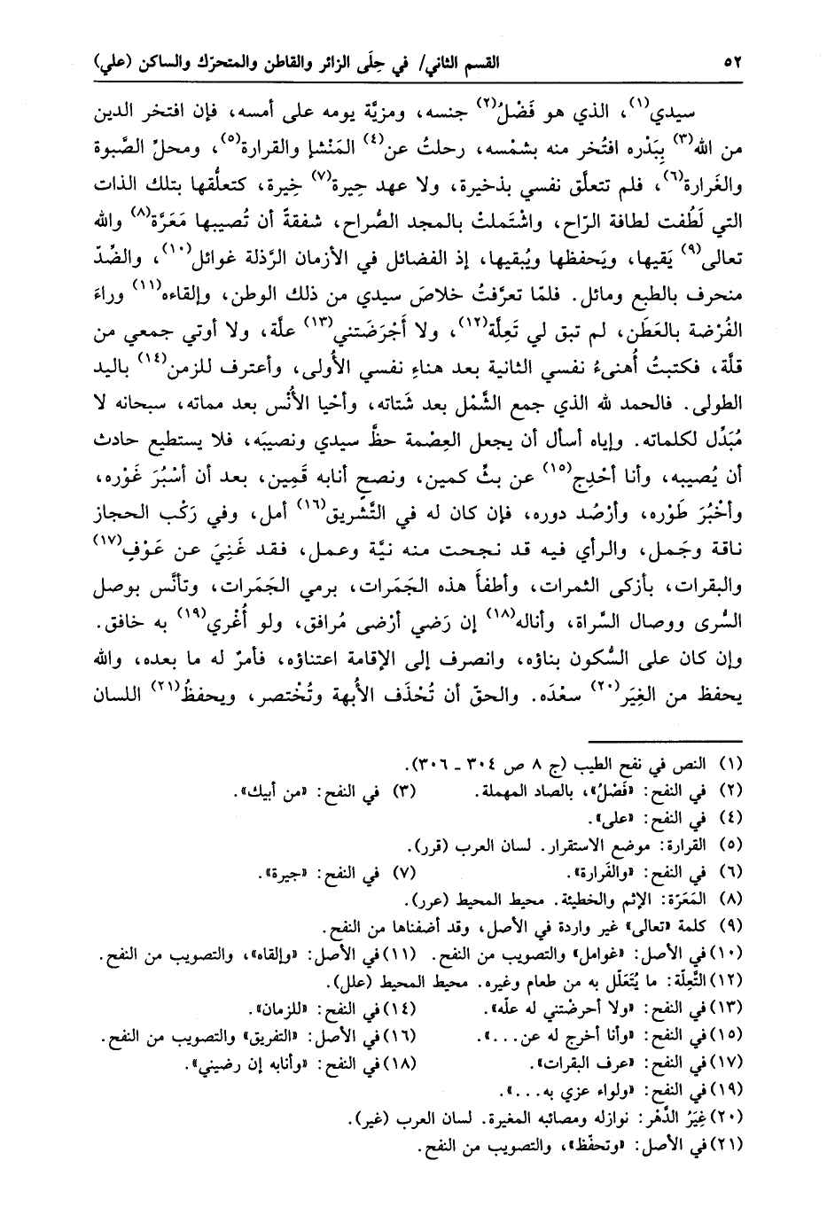 سيدي «1» ، الذي هو فضل «2» جنسه، ومزيّة يومه على أمسه، فإن افتخر الدين من الله «3» ببدره افتخر منه بشمسه، رحلت عن «4» المنشإ والقرارة «5» ، ومحلّ الصّبوة والغرارة «6» ، فلم تتعلّق نفسي بذخيرة، ولا عهد حيرة «7» خيرة، كتعلّقها بتلك الذات التي لطفت لطافة الرّاح، واشتملت بالمجد الصّراح، شفقة أن تصيبها معرّة «8» والله تعالى «9» يقيها، ويحفظها ويبقيها، إذ الفضائل في الأزمان الرّذلة غوائل «10» ، والضّدّ منحرف بالطبع ومائل. فلمّا تعرّفت خلاص سيدي من ذلك الوطن، وإلقاءه «11» وراء الفرضة بالعطن، لم تبق لي تعلّة «12» ، ولا أجرضتني «13» علّة، ولا أوتي جمعي من قلّة، فكتبت أهنىء نفسي الثانية بعد هناء نفسي الأولى، وأعترف للزمن «14» باليد الطولى. فالحمد لله الذي جمع الشّمل بعد شتاته، وأحيا الأنس بعد مماته، سبحانه لا مبدّل لكلماته. وإياه أسأل أن يجعل العصمة حظّ سيدي ونصيبه، فلا يستطيع حادث أن يصيبه، وأنا أحدج «15» عن بثّ كمين، ونصح أنابه قمين، بعد أن أسبر غوره، وأخبر طوره، وأرصد دوره، فإن كان له في التّشريق «16» أمل، وفي ركب الحجاز ناقة وجمل، والرأي فيه قد نجحت منه نيّة وعمل، فقد غني عن عوف «17» والبقرات، بأزكى الثمرات، وأطفأ هذه الجمرات، برمي الجمرات، وتأنّس بوصل السّرى ووصال السّراة، وأناله «18» إن رضي مرافق، ولو أغري «19» به خافق.