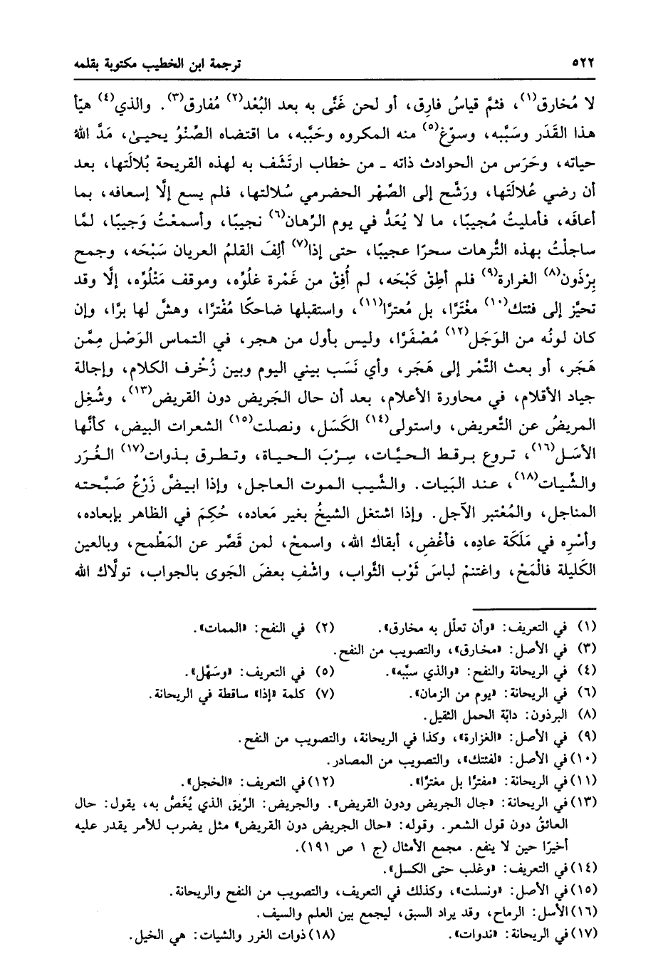لا مخارق «1» ، فثمّ قياس فارق، أو لحن غنّى به بعد البعد «2» مفارق «3» . والذي «4» هيّأ هذا القدر وسبّبه، وسوّغ «5» منه المكروه وحبّبه، ما اقتضاه الصّنو يحيى، مدّ الله حياته، وحرس من الحوادث ذاته- من خطاب ارتشف به لهذه القريحة بلالتها، بعد أن رضي علالتها، ورشّح إلى الصّهر الحضرمي سلالتها، فلم يسع إلّا إسعافه، بما أعافه، فأمليت مجيبا، ما لا يعدّ في يوم الرّهان «6» نجيبا، وأسمعت وجيبا، لمّا ساجلت بهذه التّرهات سحرا عجيبا، حتى إذا «7» ألف القلم العريان سبحه، وجمح برذون «8» الغرارة «9» فلم أطق كبحه، لم أفق من غمرة غلوّه، وموقف متلوّه، إلّا وقد تحيّز إلى فئتك «10» مغترّا، بل معترّا «11» ، واستقبلها ضاحكا مفترّا، وهشّ لها برّا، وإن كان لونه من الوجل «12» مصفرّا، وليس بأول من هجر، في التماس الوصل ممّن هجر، أو بعث التّمر إلى هجر، وأي نسب بيني اليوم وبين زخرف الكلام، وإجالة جياد الأقلام، في محاورة الأعلام، بعد أن حال الجريض دون القريض «13» ، وشغل المريض عن التّعريض، واستولى «14» الكسل، ونصلت «15» الشعرات البيض، كأنّها الأسل «16» ، تروع برقط الحيّات، سرب الحياة، وتطرق بذوات «17» الغرر والشّيات «18» ، عند البيات. والشّيب الموت العاجل، وإذا ابيضّ زرع صبّحته المناجل، والمعتبر الآجل. وإذا اشتغل الشيخ بغير معاده، حكم في الظاهر بإبعاده، وأسره في ملكة عاده، فأغض، أبقاك الله، واسمح، لمن قصّر عن المطمح، وبالعين الكليلة فالمح، واغتنم لباس ثوب الثّواب، واشف بعض الجوى بالجواب، تولّاك الله