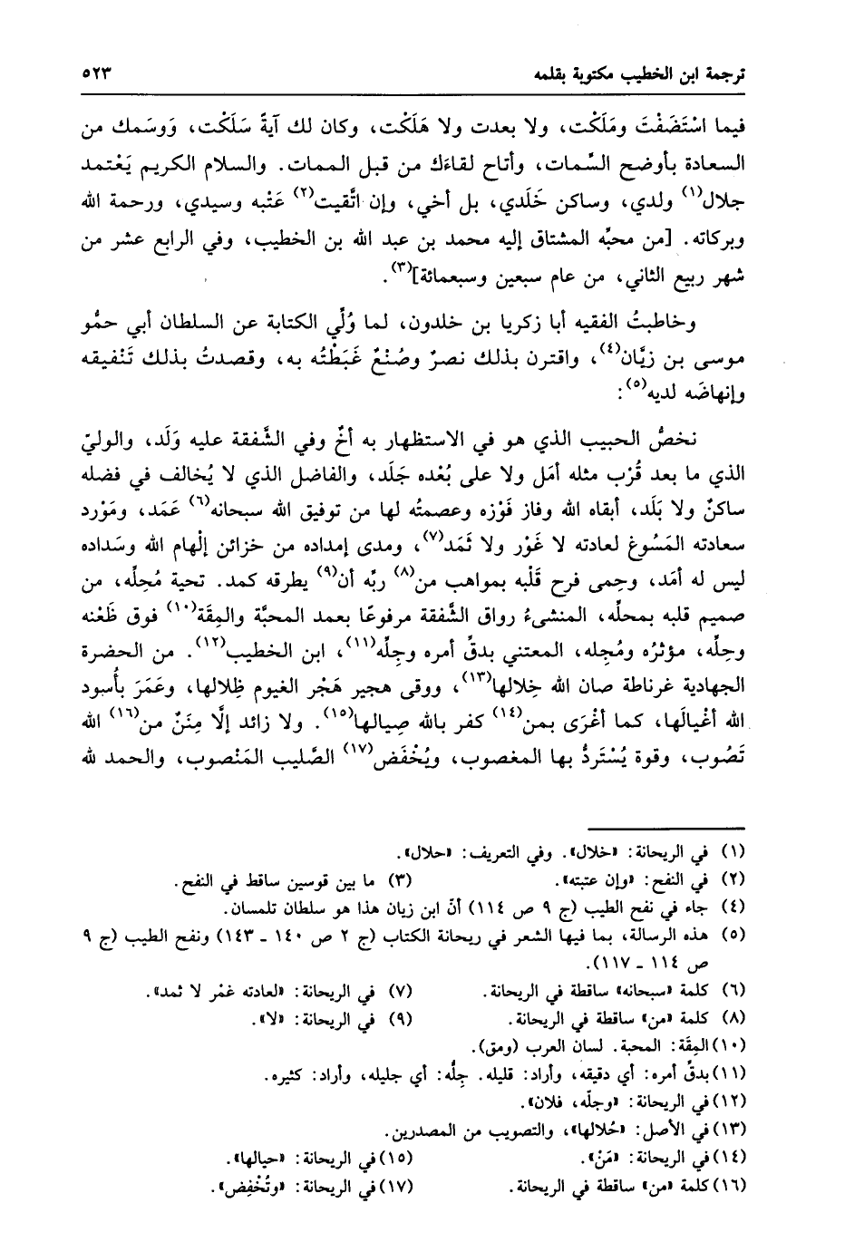 فيما استضفت وملكت، ولا بعدت ولا هلكت، وكان لك آية سلكت، ووسمك من السعادة بأوضح السّمات، وأتاح لقاءك من قبل الممات. والسلام الكريم يعتمد جلال «1» ولدي، وساكن خلدي، بل أخي، وإن اتّقيت «2» عتبه وسيدي، ورحمة الله وبركاته. [من محبّه المشتاق إليه محمد بن عبد الله بن الخطيب، وفي الرابع عشر من شهر ربيع الثاني، من عام سبعين وسبعمائة] «3» .