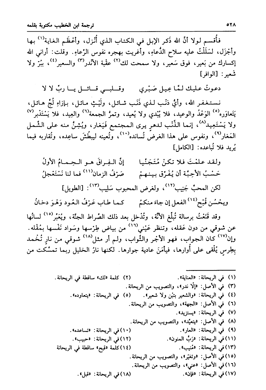نستغفر الله، وأيّ ذنب لذي ذنب شائل، وليث مائل، بإزاء لجّ هائل، يتعاوره «5» الوعد والوعيد، فلا يبدي ولا يعيد، وتمرّ الجمعة «6» والعيد، فلا يستدبر «7» ولا يستعيد «8» ، إنما الذّنب لدهر يرى المجتمع فيغار، ويشنّ منه على الشّمل المغار «9» ، ونفوس على هذا الغرض تسانده «10» ، وتعينه ليبطش ساعده، وتقاربه فيما يريد فلا تباعده: [الكامل]