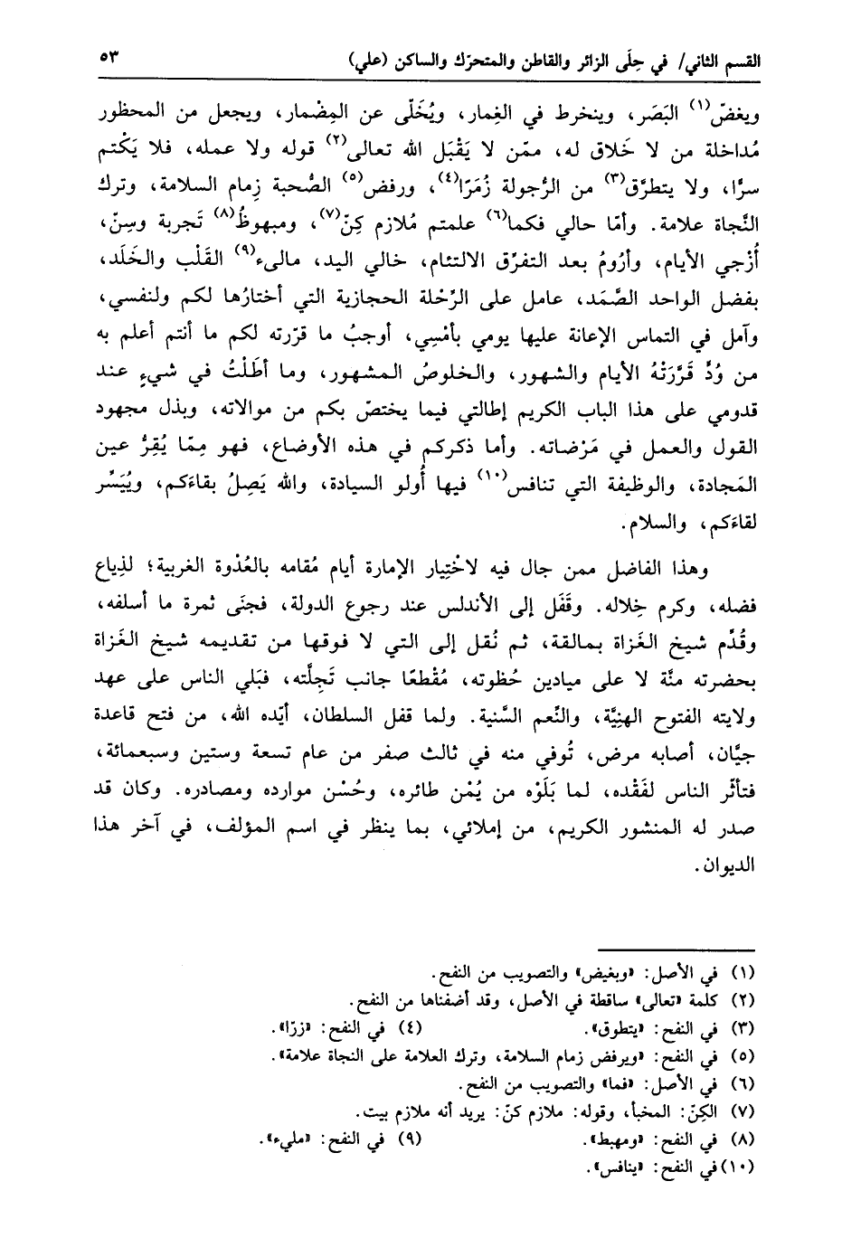 وهذا الفاضل ممن جال فيه لاختيار الإمارة أيام مقامه بالعدوة الغربية؛ لذياع فضله، وكرم خلاله. وقفل إلى الأندلس عند رجوع الدولة، فجنى ثمرة ما أسلفه، وقدّم شيخ الغزاة بمالقة، ثم نقل إلى التي لا فوقها من تقديمه شيخ الغزاة بحضرته منّة لا على ميادين حظوته، مقطعا جانب تجلّته، فبلي الناس على عهد ولايته الفتوح الهنيّة، والنّعم السّنية. ولما قفل السلطان، أيّده الله، من فتح قاعدة جيّان، أصابه مرض، توفي منه في ثالث صفر من عام تسعة وستين وسبعمائة، فتأثّر الناس لفقده، لما بلوه من يمن طائره، وحسن موارده ومصادره. وكان قد صدر له المنشور الكريم، من إملائي، بما ينظر في اسم المؤلف، في آخر هذا الديوان.