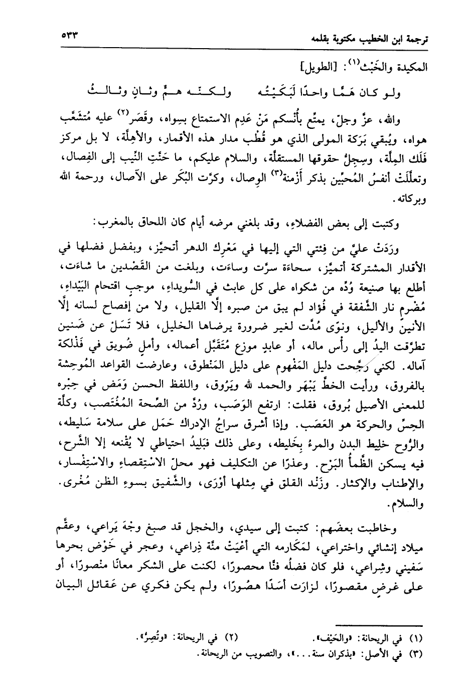وردت عليّ من فئتي التي إليها في معرك الدهر أتحيّز، وبفضل فضلها في الأقدار المشتركة أتميّز، سحاءة سرّت وساءت، وبلغت من القصدين ما شاءت، أطلع بها صنيعة ودّه من شكواه على كل عابث في السّويداء، موجب اقتحام البيداء، مضرم نار الشّفقة في فؤاد لم يبق من صبره إلّا القليل، ولا من إفصاح لسانه إلّا الأنين والأليل، ونوى مدّت لغير ضرورة يرضاها الخليل، فلا تسل عن ضنين تطرّقت اليد إلى رأس ماله، أو عابد موزع متقبّل أعماله، وأمل ضويق في فذلكة آماله. لكني رجّحت دليل المفهوم على دليل المنطوق، وعارضت القواعد الموحشة بالفروق، ورأيت الخطّ يبهر والحمد لله ويروق، واللفظ الحسن ومض في حبره للمعنى الأصيل بروق، فقلت: ارتفع الوصب، وردّ من الصّحة المغتصب، وكلّة الحسّ والحركة هو العصب. وإذا أشرق سراج الإدراك حمل على سلامة سليطه، والرّوح خليط البدن والمرء بخليطه، وعلى ذلك فبليد احتياطي لا يقنعه إلا الشّرح، فيه يسكن الظّمأ البرح. وعذرا عن التكليف فهو محلّ الاستقصاء والاستفسار، والإطناب والإكثار. وزند القلق في مثلها أورى، والشّفيق بسوء الظن مغرى.