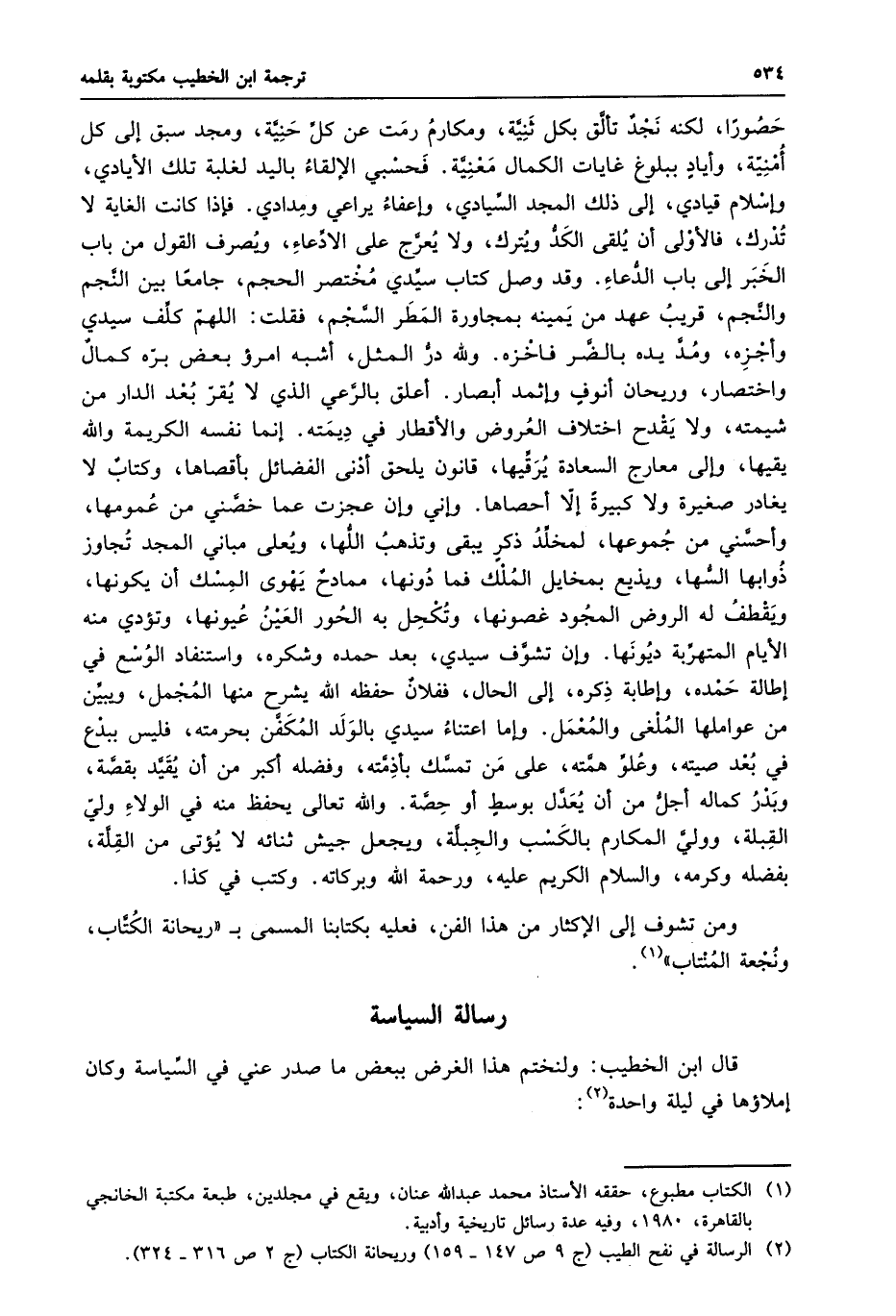 قال ابن الخطيب: ولنختم هذا الغرض ببعض ما صدر عني في السّياسة وكان إملاؤها في ليلة واحدة «2» :