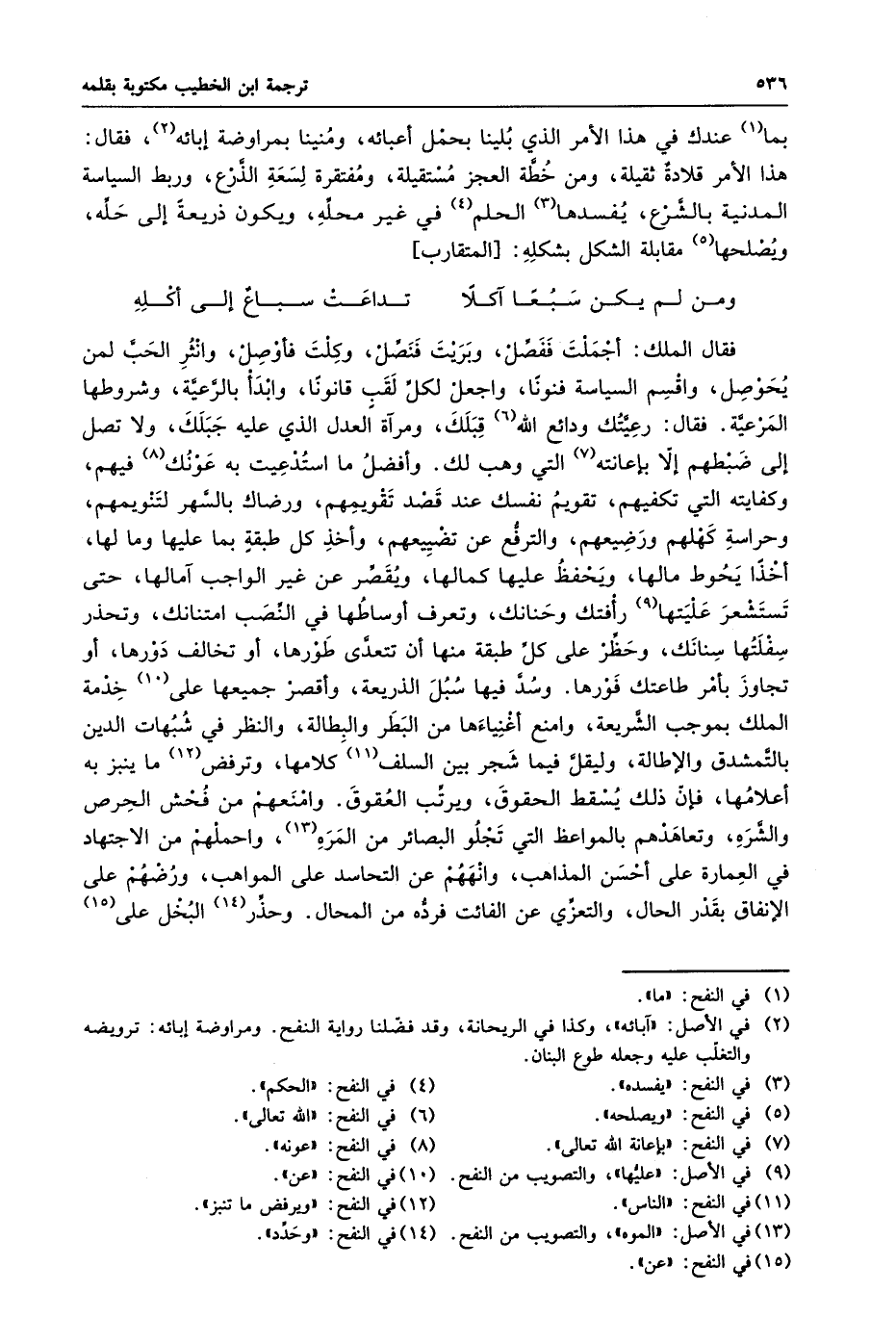 فقال الملك: أجملت ففصّل، وبريت فنصّل، وكلت فأوصل، وانثر الحبّ لمن يحوصل، واقسم السياسة فنونا، واجعل لكلّ لقب قانونا، وابدأ بالرّعيّة، وشروطها المرعيّة. فقال: رعيّتك ودائع الله «6» قبلك، ومرآة العدل الذي عليه جبلك، ولا تصل إلى ضبطهم إلّا بإعانته «7» التي وهب لك. وأفضل ما استدعيت به عونك «8» فيهم، وكفايته التي تكفيهم، تقويم نفسك عند قصد تقويمهم، ورضاك بالسّهر لتنويمهم، وحراسة كهلهم ورضيعهم، والترفّع عن تضييعهم، وأخذ كل طبقة بما عليها وما لها، أخذا يحوط مالها، ويحفظ عليها كمالها، ويقصّر عن غير الواجب آمالها، حتى تستشعر عليتها «9» رأفتك وحنانك، وتعرف أوساطها في النّصب امتنانك، وتحذر سفلتها سنانك، وحظّر على كلّ طبقة منها أن تتعدّى طورها، أو تخالف دورها، أو تجاوز بأمر طاعتك فورها. وسدّ فيها سبل الذريعة، وأقصر جميعها على «10» خدمة الملك بموجب الشّريعة، وامنع أغنياءها من البطر والبطالة، والنظر في شبهات الدين بالتّمشدق والإطالة، وليقلّ فيما شجر بين السلف «11» كلامها، وترفض «12» ما ينبز به أعلامها، فإنّ ذلك يسقط الحقوق، ويرتّب العقوق. وامنعهم من فحش الحرص والشّره، وتعاهدهم بالمواعظ التي تجلو البصائر من المره «13» ، واحملهم من الاجتهاد في العمارة على أحسن المذاهب، وانهم عن التحاسد على المواهب، ورضهم على الإنفاق بقدر الحال، والتعزّي عن الفائت فردّه من المحال. وحذّر «14» البخل على «15»