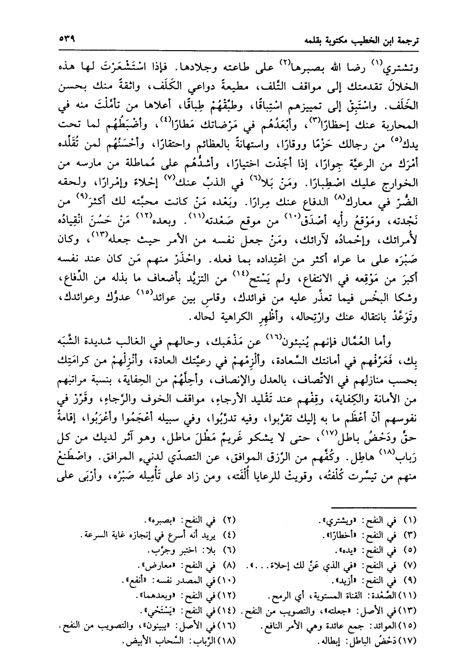 وتشتري «1» رضا الله بصبرها «2» على طاعته وجلادها. فإذا استشعرت لها هذه الخلال تقدمتك إلى مواقف التّلف، مطيعة دواعي الكلف، واثقة منك بحسن الخلف. واستبق إلى تمييزهم استباقا، وطبّقهم طباقا، أعلاها من تأمّلت منه في المحاربة عنك إحظارا «3» ، وأبعدهم في مرضاتك مطارا «4» ، وأضبطهم لما تحت يدك «5» من رجالك حزما ووقارا، واستهانة بالعظائم واحتقارا، وأحسنهم لمن تقلّده أمرك من الرعيّة جوارا، إذا أجدت اختيارا، وأشدّهم على مماطلة من مارسه من الخوارج عليك اصطبارا. ومن بلا «6» في الذبّ عنك «7» إحلاء وإمرارا، ولحقه الضّرّ في معارك «8» الدفاع عنك مرارا. وبعده من كانت محبّته لك أكثر «9» من نجدته، وموقع رأيه أصدق «10» من موقع صعدته «11» . وبعده «12» من حسن انقياده لأمرائك، وإحماده لآرائك، ومن جعل نفسه من الأمر حيث جعله «13» ، وكان صبره على ما عراه أكثر من اعتداده بما فعله. واحذر منهم من كان عند نفسه أكبر من موقعه في الانتفاع، ولم يستح «14» من التزيّد بأضعاف ما بذله من الدّفاع، وشكا البخس فيما تعذّر عليه من فوائدك، وقاس بين عوائد «15» عدوّك وعوائدك، وتوعّد بانتقاله عنك وارتحاله، وأظهر الكراهية لحاله.
