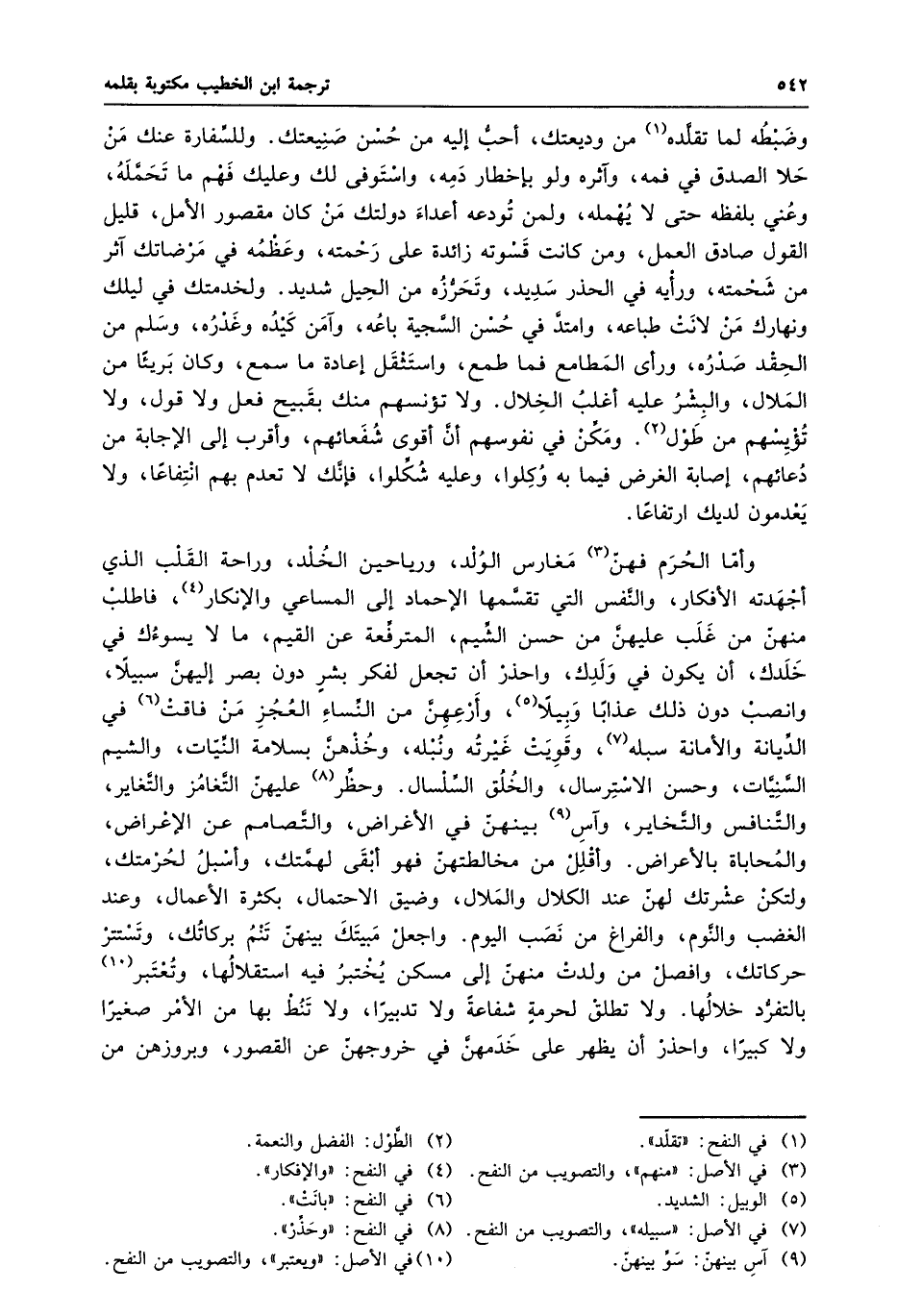 وأمّا الحرم فهنّ «3» مغارس الولد، ورياحين الخلد، وراحة القلب الذي أجهدته الأفكار، والنّفس التي تقسّمها الإحماد إلى المساعي والإنكار «4» ، فاطلب منهنّ من غلب عليهنّ من حسن الشّيم، المترفّعة عن القيم، ما لا يسوءك في خلدك، أن يكون في ولدك، واحذر أن تجعل لفكر بشر دون بصر إليهنّ سبيلا، وانصب دون ذلك عذابا وبيلا «5» ، وأرعهنّ من النّساء العجز من فاقت «6» في الدّيانة والأمانة سبله «7» ، وقويت غيرته ونبله، وخذهنّ بسلامة النّيّات، والشيم السّنيّات، وحسن الاسترسال، والخلق السّلسال. وحظّر «8» عليهنّ التّغامز والتّغاير، والتّنافس والتّخاير، وآس «9» بينهنّ في الأغراض، والتّصامم عن الإعراض، والمحاباة بالأعراض. وأقلل من مخالطتهنّ فهو أبقى لهمّتك، وأسبل لحرمتك، ولتكن عشرتك لهنّ عند الكلال والملال، وضيق الاحتمال، بكثرة الأعمال، وعند الغضب والنّوم، والفراغ من نصب اليوم. واجعل مبيتك بينهنّ تنم بركاتك، وتستتر حركاتك، وافصل من ولدت منهنّ إلى مسكن يختبر فيه استقلالها، وتعتبر «10» بالتفرّد خلالها. ولا تطلق لحرمة شفاعة ولا تدبيرا، ولا تنط بها من الأمر صغيرا ولا كبيرا، واحذر أن يظهر على خدمهنّ في خروجهنّ عن القصور، وبروزهن من