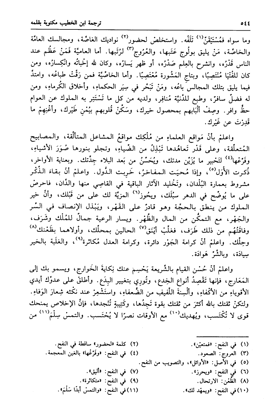 واعلم بأنّ مواقع العلماء من ملكك مواقع المشاعل المتألّقة، والمصابيح المتعلّقة، وعلى قدر تعاهدها تبذل من الضّياء، وتجلو بنورها صور الأشياء، وفرّعها «4» لتحبير ما يزيّن مدتك، ويحسّن من بعد البلاء جدّتك. وبعناية الأواخر، ذكرت الأول «5» ، وإذا محيت المفاخر، خربت الدّول. واعلم أنّ بقاء الذّكر مشروط بعمارة البلدان، وتخليد الآثار الباقية في القاصي منها والدّان، فاحرص على ما يوضّح في الدهر سبلك، ويحوز «6» المزيّة لك على من قبلك، وأنّ خير الملوك من ينطق بالحجّة وهو قادر على القهر، ويبذل الإنصاف في السّر والجهر، مع التمكّن من المال والظّهر. ويسار الرعية جمال للملك وشرف، وفاقتهم من ذلك طرف، فغلّب أينق «7» الحالين بمحلّك، وأولاهما بظعنك «8» وحلّك. واعلم أنّ كرامة الجور دائرة، وكرامة العدل مكاثرة «9» ، والغلبة بالخير سيادة، وبالشّرّ هوادة.