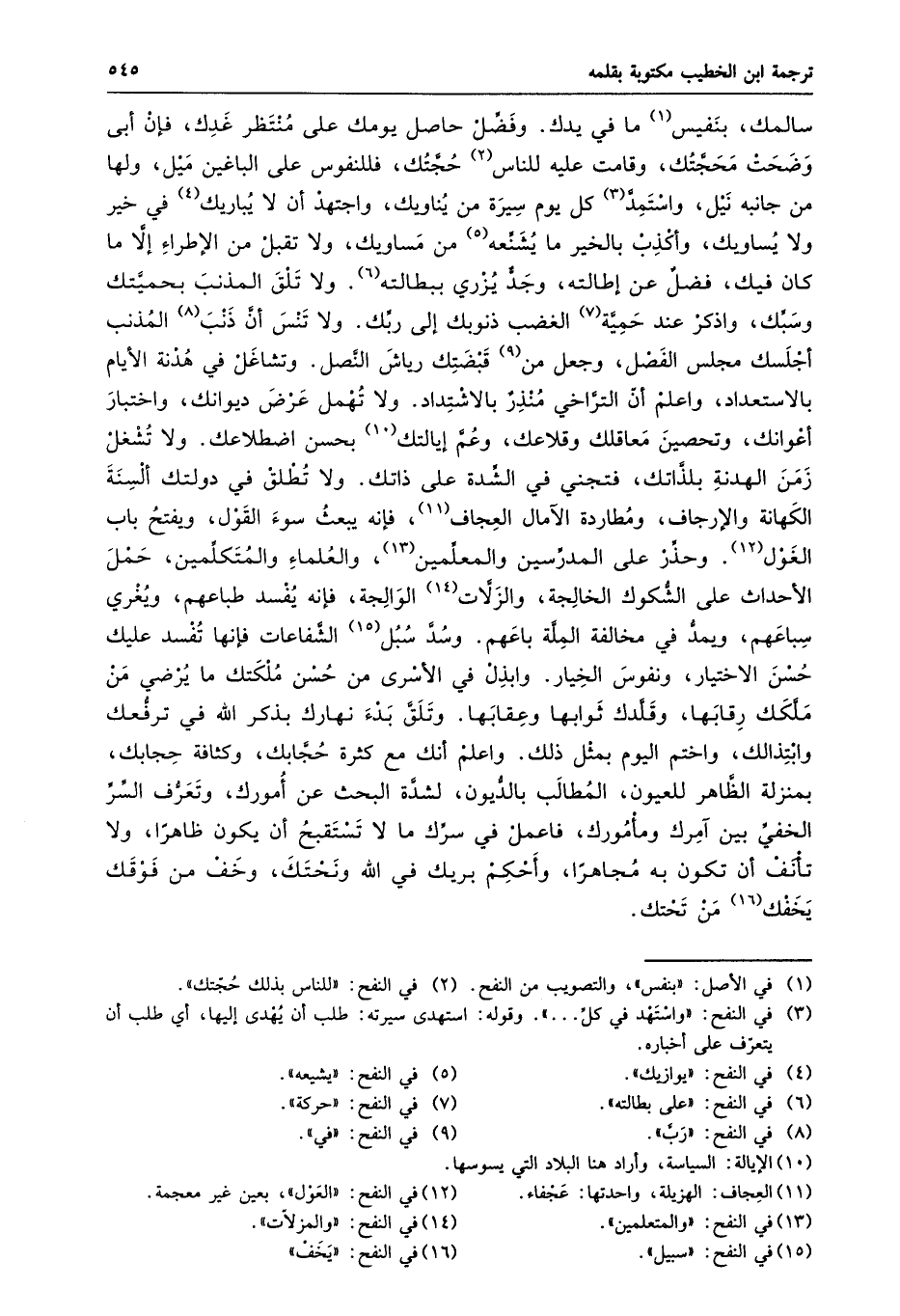 سالمك، بنفيس «1» ما في يدك. وفضّل حاصل يومك على منتظر غدك، فإن أبى وضحت محجّتك، وقامت عليه للناس «2» حجّتك، فللنفوس على الباغين ميل، ولها من جانبه نيل، واستمدّ «3» كل يوم سيرة من يناويك، واجتهد أن لا يباريك «4» في خير ولا يساويك، وأكذب بالخير ما يشنّعه «5» من مساويك، ولا تقبل من الإطراء إلّا ما كان فيك، فضل عن إطالته، وجدّ يزري ببطالته «6» . ولا تلق المذنب بحميّتك وسبّك، واذكر عند حميّة «7» الغضب ذنوبك إلى ربّك. ولا تنس أنّ ذنب «8» المذنب أجلسك مجلس الفصل، وجعل من «9» قبضتك رياش النّصل. وتشاغل في هدنة الأيام بالاستعداد، واعلم أنّ التّراخي منذر بالاشتداد. ولا تهمل عرض ديوانك، واختبار أعوانك، وتحصين معاقلك وقلاعك، وعمّ إيالتك «10» بحسن اضطلاعك. ولا تشغل زمن الهدنة بلذّاتك، فتجني في الشّدة على ذاتك. ولا تطلق في دولتك ألسنة الكهانة والإرجاف، ومطاردة الآمال العجاف «11» ، فإنه يبعث سوء القول، ويفتح باب الغول «12» . وحذّر على المدرّسين والمعلّمين «13» ، والعلماء والمتكلّمين، حمل الأحداث على الشّكوك الخالجة، والزلّات «14» الوالجة، فإنه يفسد طباعهم، ويغري سباعهم، ويمدّ في مخالفة الملّة باعهم. وسدّ سبل «15» الشّفاعات فإنها تفسد عليك حسن الاختيار، ونفوس الخيار. وابذل في الأسرى من حسن ملكتك ما يرضي من ملّكك رقابها، وقلّدك ثوابها وعقابها. وتلقّ بدء نهارك بذكر الله في ترفّعك وابتذالك، واختم اليوم بمثل ذلك. واعلم أنك مع كثرة حجّابك، وكثافة حجابك، بمنزلة الظّاهر للعيون، المطالب بالدّيون، لشدّة البحث عن أمورك، وتعرّف السّرّ الخفيّ بين آمرك ومأمورك، فاعمل في سرّك ما لا تستقبح أن يكون ظاهرا، ولا تأنف أن تكون به مجاهرا، وأحكم بريك في الله ونحتك، وخف من فوقك يخفك «16» من تحتك.