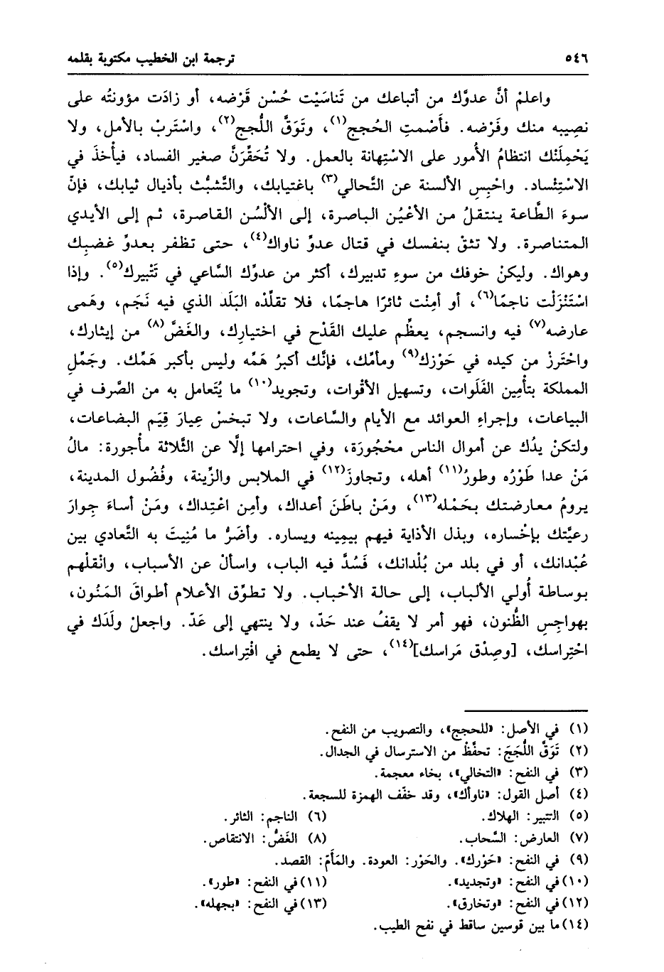 واعلم أنّ عدوّك من أتباعك من تناسيت حسن قرضه، أو زادت مؤونته على نصيبه منك وفرضه. فأصمت الحجج «1» ، وتوقّ اللّجج «2» ، واسترب بالأمل، ولا يحملنك انتظام الأمور على الاستهانة بالعمل. ولا تحقّرنّ صغير الفساد، فيأخذ في الاستئساد. واحبس الألسنة عن التّحالي «3» باغتيابك، والتّشبّث بأذيال ثيابك، فإنّ سوء الطّاعة ينتقل من الأعين الباصرة، إلى الألسن القاصرة، ثم إلى الأيدي المتناصرة. ولا تثق بنفسك في قتال عدوّ ناواك «4» ، حتى تظفر بعدوّ غضبك وهواك. وليكن خوفك من سوء تدبيرك، أكثر من عدوّك السّاعي في تتبيرك «5» . وإذا استنزلت ناجما «6» ، أو أمنت ثائرا هاجما، فلا تقلّده البلد الذي فيه نجم، وهمى عارضه «7» فيه وانسجم، يعظّم عليك القدح في اختيارك، والغضّ «8» من إيثارك، واحترز من كيده في حوزك «9» ومأمّك، فإنّك أكبر همّه وليس بأكبر همّك. وجمّل المملكة بتأمين الفلوات، وتسهيل الأقوات، وتجويد «10» ما يتعامل به من الصّرف في البياعات، وإجراء العوائد مع الأيام والسّاعات، ولا تبخس عيار قيم البضاعات، ولتكن يدك عن أموال الناس محجورة، وفي احترامها إلّا عن الثّلاثة مأجورة: مال من عدا طوره وطور «11» أهله، وتجاوز «12» في الملابس والزّينة، وفضول المدينة، يروم معارضتك بحمله «13» ، ومن باطن أعداك، وأمن اعتداك، ومن أساء جوار رعيّتك بإخساره، وبذل الأذاية فيهم بيمينه ويساره. وأضرّ ما منيت به التّعادي بين عبدانك، أو في بلد من بلدانك، فسدّ فيه الباب، واسأل عن الأسباب، وانقلهم بوساطة أولي الألباب، إلى حالة الأحباب. ولا تطوّق الأعلام أطواق المنون، بهواجس الظّنون، فهو أمر لا يقف عند حدّ، ولا ينتهي إلى عدّ. واجعل ولدك في احتراسك، [وصدق مراسك] «14» ، حتى لا يطمع في افتراسك.