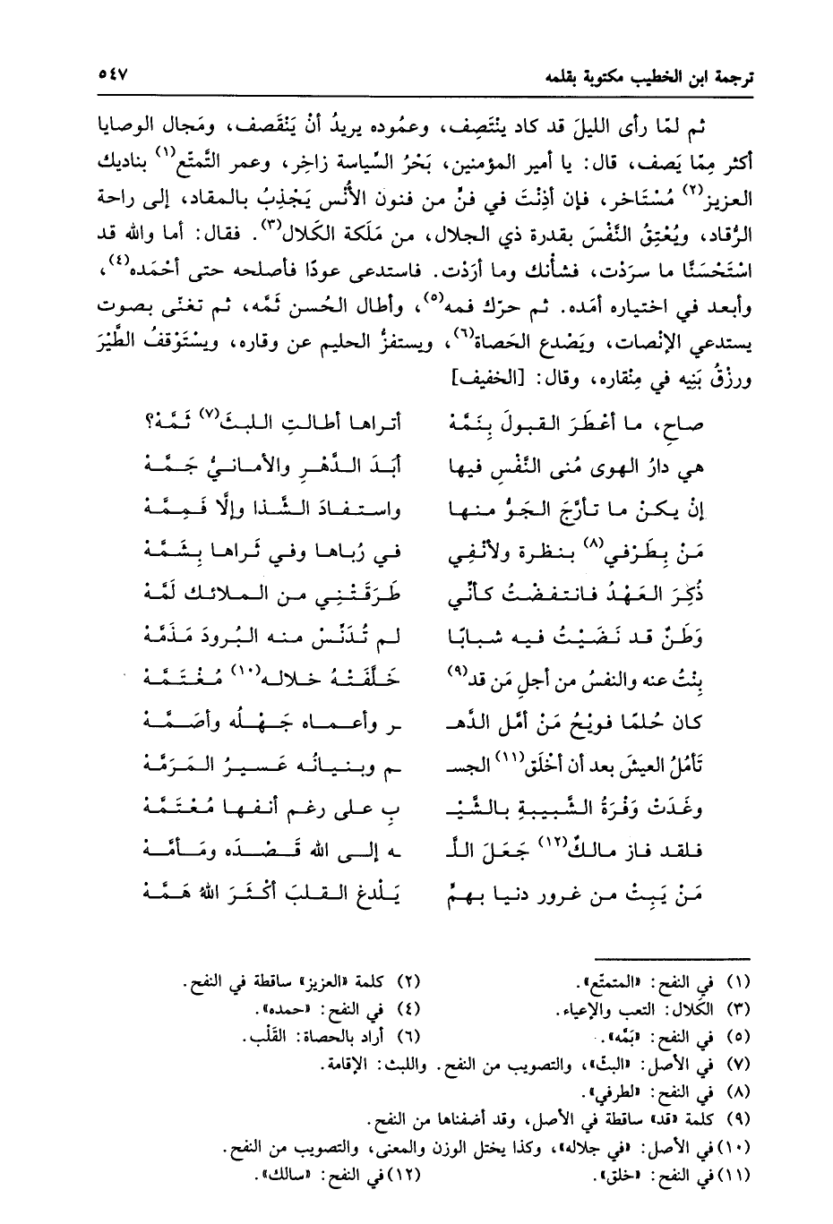 ثم لمّا رأى الليل قد كاد ينتصف، وعموده يريد أن ينقصف، ومجال الوصايا أكثر ممّا يصف، قال: يا أمير المؤمنين، بحر السّياسة زاخر، وعمر التّمتّع «1» بناديك العزيز «2» مستأخر، فإن أذنت في فنّ من فنون الأنس يجذب بالمقاد، إلى راحة الرّقاد، ويعتق النّفس بقدرة ذي الجلال، من ملكة الكلال «3» . فقال: أما والله قد استحسنّا ما سردت، فشأنك وما أردت. فاستدعى عودا فأصلحه حتى أحمده «4» ، وأبعد في اختياره أمده. ثم حرّك فمه «5» ، وأطال الحسن ثمّه، ثم تغنّى بصوت يستدعي الإنصات، ويصدع الحصاة «6» ، ويستفزّ الحليم عن وقاره، ويستوقف الطّير ورزق بنيه في منقاره، وقال: [الخفيف]