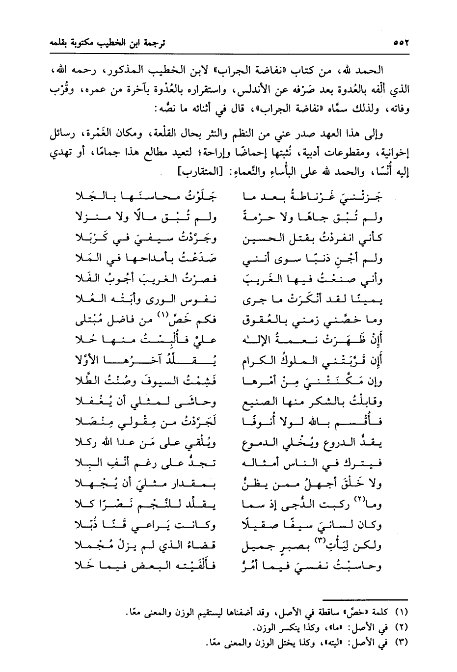 الحمد لله، من كتاب «نفاضة الجراب» لابن الخطيب المذكور، رحمه الله، الذي ألّفه بالعدوة بعد صرفه عن الأندلس، واستقراره بالعدوة بآخرة من عمره، وقرب وفاته، ولذلك سمّاه «نفاضة الجراب» ، قال في أثنائه ما نصّه: