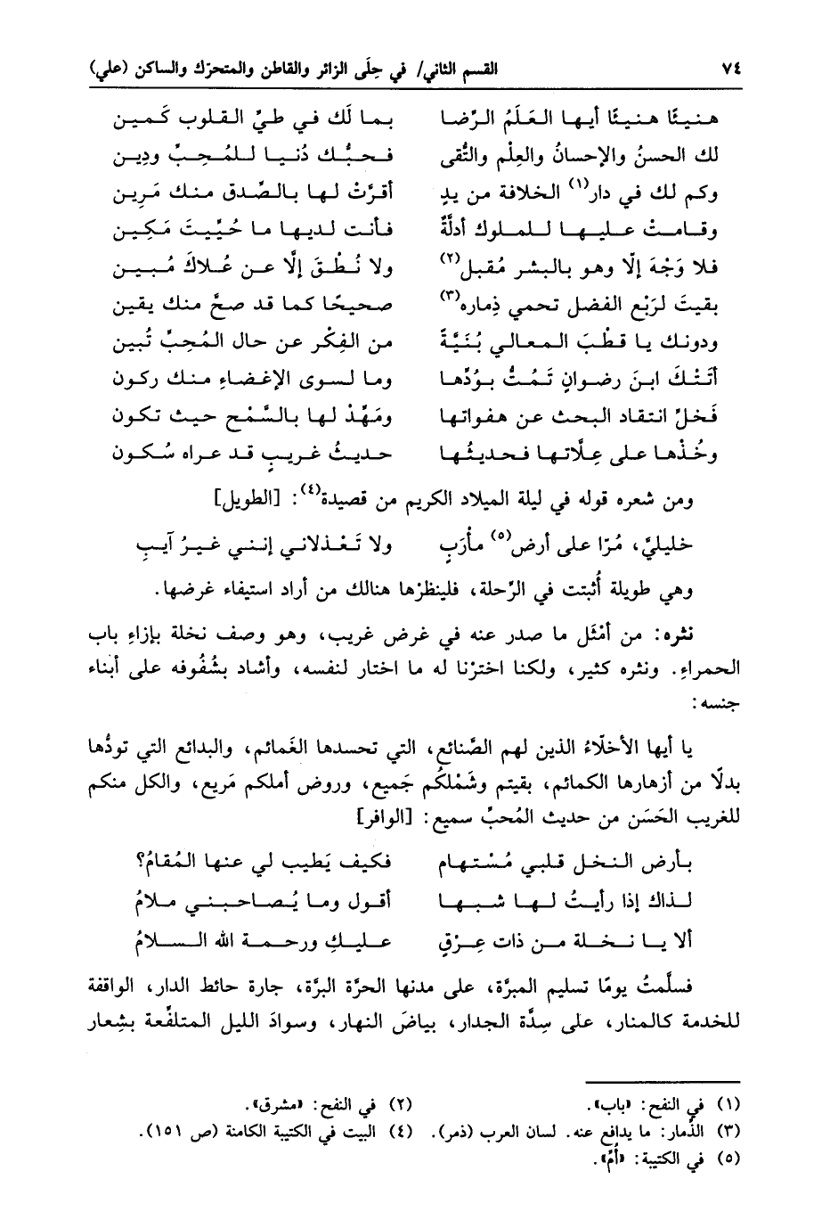 فسلّمت يوما تسليم المبرّة، على مدنها الحرّة البرّة، جارة حائط الدار، الواقفة للخدمة كالمنار، على سدّة الجدار، بياض النهار، وسواد الليل المتلفّعة بشعار