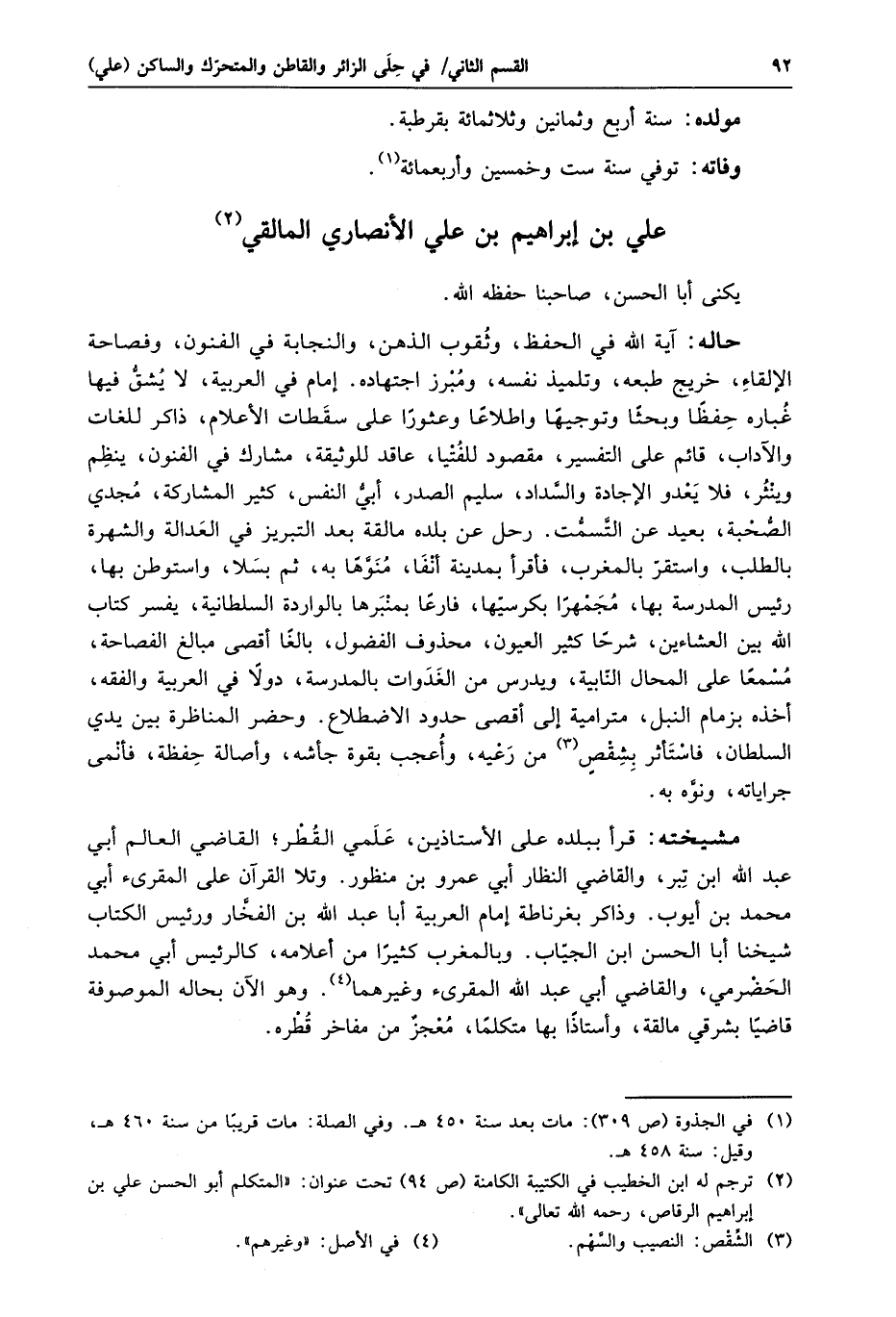 مشيخته: قرأ ببلده على الأستاذين، علمي القطر؛ القاضي العالم أبي عبد الله ابن تبر، والقاضي النظار أبي عمرو بن منظور. وتلا القرآن على المقرئ أبي محمد بن أيوب. وذاكر بغرناطة إمام العربية أبا عبد الله بن الفخّار ورئيس الكتاب شيخنا أبا الحسن ابن الجيّاب. وبالمغرب كثيرا من أعلامه، كالرئيس أبي محمد الحضرمي، والقاضي أبي عبد الله المقرئ وغيرهما «4» . وهو الآن بحاله الموصوفة قاضيا بشرقي مالقة، وأستاذا بها متكلما، معجز من مفاخر قطره.