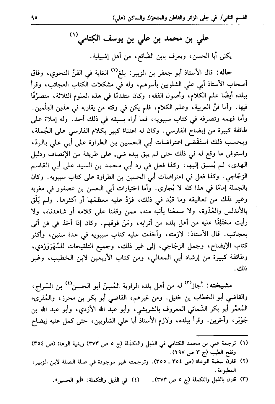 حاله: قال الأستاذ أبو جعفر بن الزبير: بلغ «2» الغاية في الفنّ النحوي، وفاق أصحاب الأستاذ أبي علي الشلوبين بأسرهم، وله في مشكلات الكتاب العجائب، وقرأ ببلده أيضا علم الكلام، وأصول الفقه، وكان متقدما في هذه العلوم الثلاثة، متصرّفا فيها. وأما فنّ العربية، وعلم الكلام، فلم يكن في وقته من يقاربه في هذين العلمين.