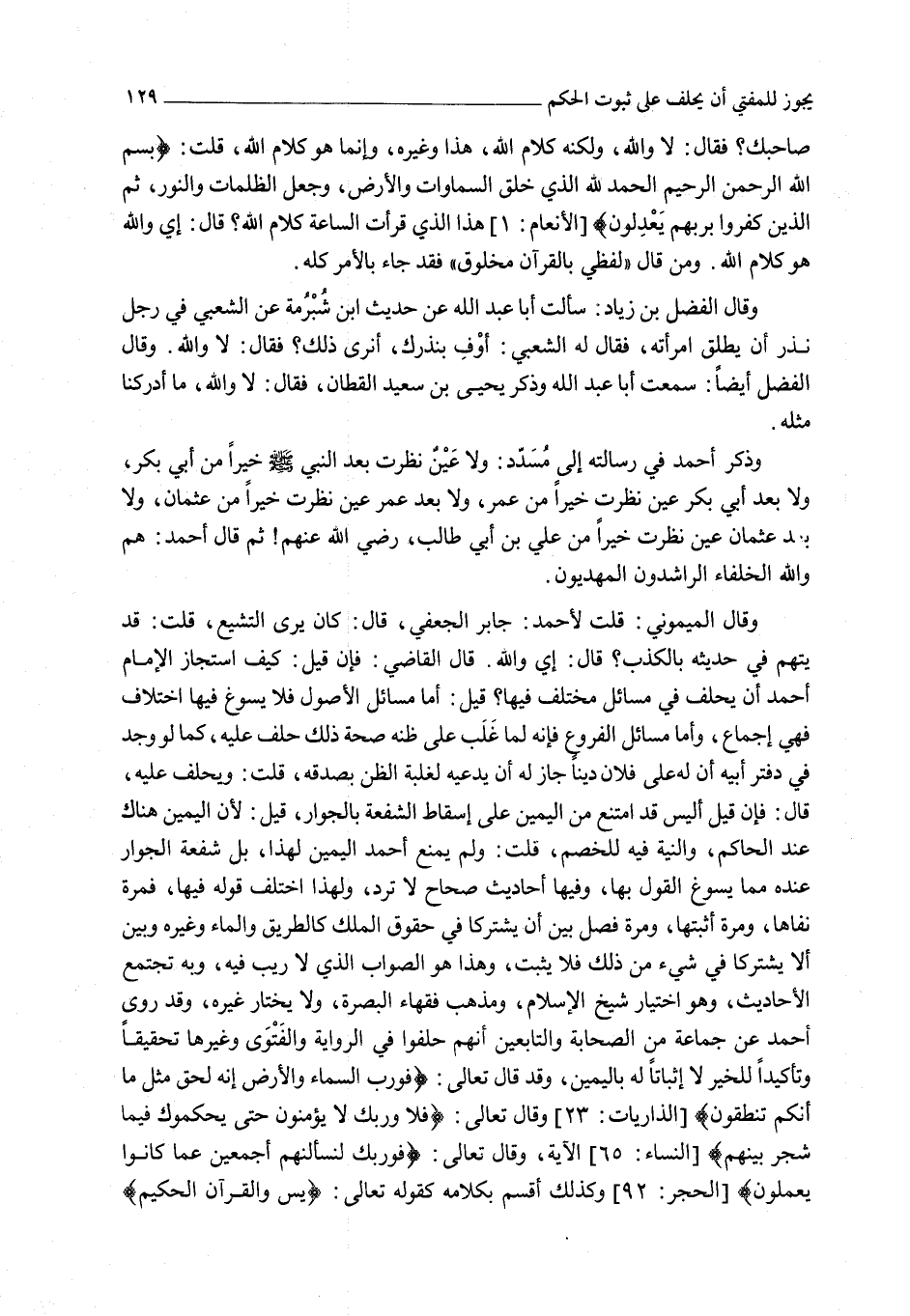قَالَ الْقَاضِي: فَإِنْ قِيلَ: كَيْفَ اسْتَجَازَ الْإِمَامُ أَحْمَدُ أَنْ يَحْلِفَ فِي مَسَائِلَ مُخْتَلَفٍ فِيهَا؟ قِيلَ: أَمَّا مَسَائِلُ الْأُصُولِ فَلَا يَسُوغُ فِيهَا اخْتِلَافٌ فَهِيَ إجْمَاعٌ، وَأَمَّا مَسَائِلُ الْفُرُوعِ فَإِنَّهُ لَمَّا غَلَبَ عَلَى ظَنِّهِ صِحَّةُ ذَلِكَ حَلَفَ عَلَيْهِ، كَمَا لَوْ وَجَدَ فِي دَفْتَرِ أَبِيهِ أَنَّ لَهُ عَلَى فُلَانٍ دَيْنًا جَازَ لَهُ أَنْ يَدَّعِيَهُ لِغَلَبَةِ الظَّنِّ بِصِدْقِهِ، قُلْت: وَيَحْلِفُ عَلَيْهِ، قَالَ: فَإِنْ قِيلَ أَلَيْسَ قَدْ امْتَنَعَ مِنْ الْيَمِينِ عَلَى إسْقَاطِ الشُّفْعَةِ بِالْجِوَارِ، قِيلَ: لِأَنَّ الْيَمِينَ هُنَاكَ عِنْدَ الْحَاكِمِ، وَالنِّيَّةَ فِيهِ لِلْخَصْمِ، قُلْت: وَلَمْ يَمْنَعْ أَحْمَدُ الْيَمِينَ لِهَذَا، بَلْ شُفْعَةُ الْجِوَارِ عِنْدَهُ مِمَّا يُسَوِّغُ الْقَوْلَ بِهَا، وَفِيهَا أَحَادِيثُ صِحَاحٌ لَا تُرَدُّ، وَلِهَذَا اخْتَلَفَ قَوْلُهُ فِيهَا، فَمَرَّةً نَفَاهَا، وَمَرَّةً أَثْبَتَهَا، وَمَرَّةً فَصَّلَ بَيْنَ أَنْ يَشْتَرِكَا فِي حُقُوقِ الْمِلْكِ كَالطَّرِيقِ وَالْمَاءِ وَغَيْرِهِ، وَبَيْنَ أَلَّا يَشْتَرِكَا فِي شَيْءٍ مِنْ ذَلِكَ فَلَا يَثْبُتُ.