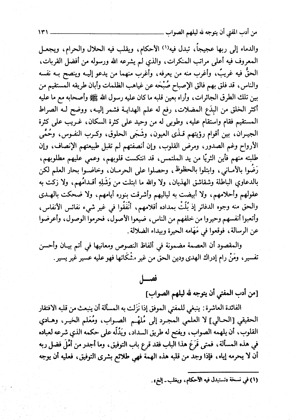 يَنْبَغِي لِلْمُفْتِي الْمُوَفَّقِ إذَا نَزَلَتْ بِهِ الْمَسْأَلَةُ أَنْ يَنْبَعِثَ مِنْ قَلْبِهِ الِافْتِقَارُ الْحَقِيقِيُّ [الْحَالِيُّ] لَا الْعِلْمِيُّ الْمُجَرَّدُ إلَى مُلْهِمِ الصَّوَابِ، وَمُعَلَّمِ الْخَيْرِ، وَهَادِي الْقُلُوبِ، أَنْ يُلْهِمَهُ الصَّوَابَ، وَيَفْتَحَ لَهُ طَرِيقَ السَّدَادِ، وَيَدُلَّهُ عَلَى حُكْمِهِ الَّذِي شَرَعَهُ لِعِبَادِهِ فِي هَذِهِ الْمَسْأَلَةِ، فَمَتَى قَرَعَ هَذَا الْبَابَ فَقَدْ قَرَعَ بَابَ التَّوْفِيقِ، وَمَا أَجْدَرَ مَنْ أَمَّلَ فَضْلَ رَبِّهِ أَنْ لَا يَحْرِمَهُ إيَّاهُ، فَإِذَا وَجَدَ مِنْ قَلْبِهِ هَذِهِ الْهِمَّةَ فَهِيَ طَلَائِعُ بُشْرَى التَّوْفِيقِ، فَعَلَيْهِ أَنْ يُوَجِّهَ