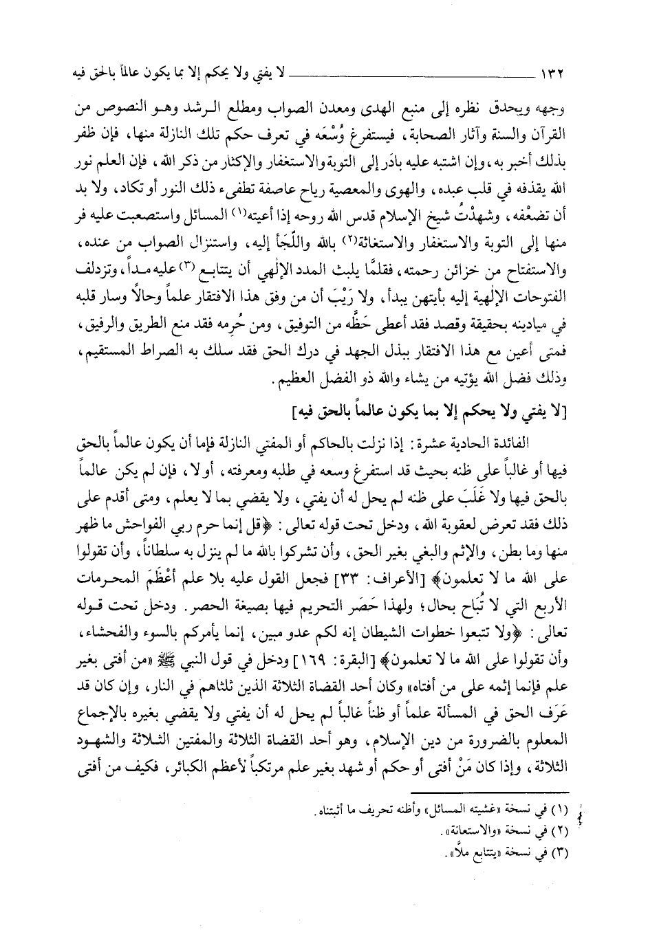[لَا يُفْتِي وَلَا يَحْكُمُ إلَّا بِمَا يَكُونُ عَالِمًا بِالْحَقِّ فِيهِ] الْفَائِدَةُ الْحَادِيَةَ عَشْرَةَ: