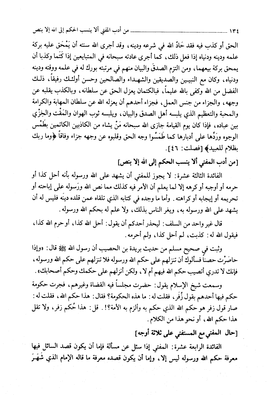 (لَا يَجُوزُ لِلْمُفْتِي أَنْ يَشْهَدَ عَلَى اللَّهِ وَرَسُولِهِ بِأَنَّهُ أَحَلَّ كَذَا أَوْ حَرَّمَهُ أَوْ أَوْجَبَهُ أَوْ كَرِهَهُ إلَّا لِمَا يَعْلَمُ أَنَّ الْأَمْرَ فِيهِ كَذَلِكَ مِمَّا نَصَّ اللَّهُ وَرَسُولُهُ عَلَى إبَاحَتِهِ أَوْ تَحْرِيمِهِ أَوْ إيجَابِهِ أَوْ كَرَاهَتِهِ) .