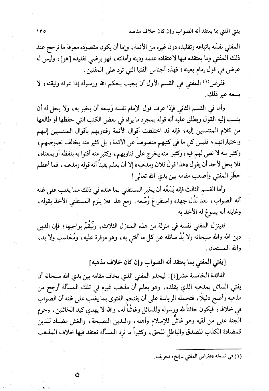 [يُفْتِي الْمُفْتِي بِمَا يَعْتَقِدُ أَنَّهُ الصَّوَابُ وَإِنْ كَانَ خِلَافَ مَذْهَبِهِ] الْفَائِدَةُ الْخَامِسَةَ عَشْرَ [ة]
