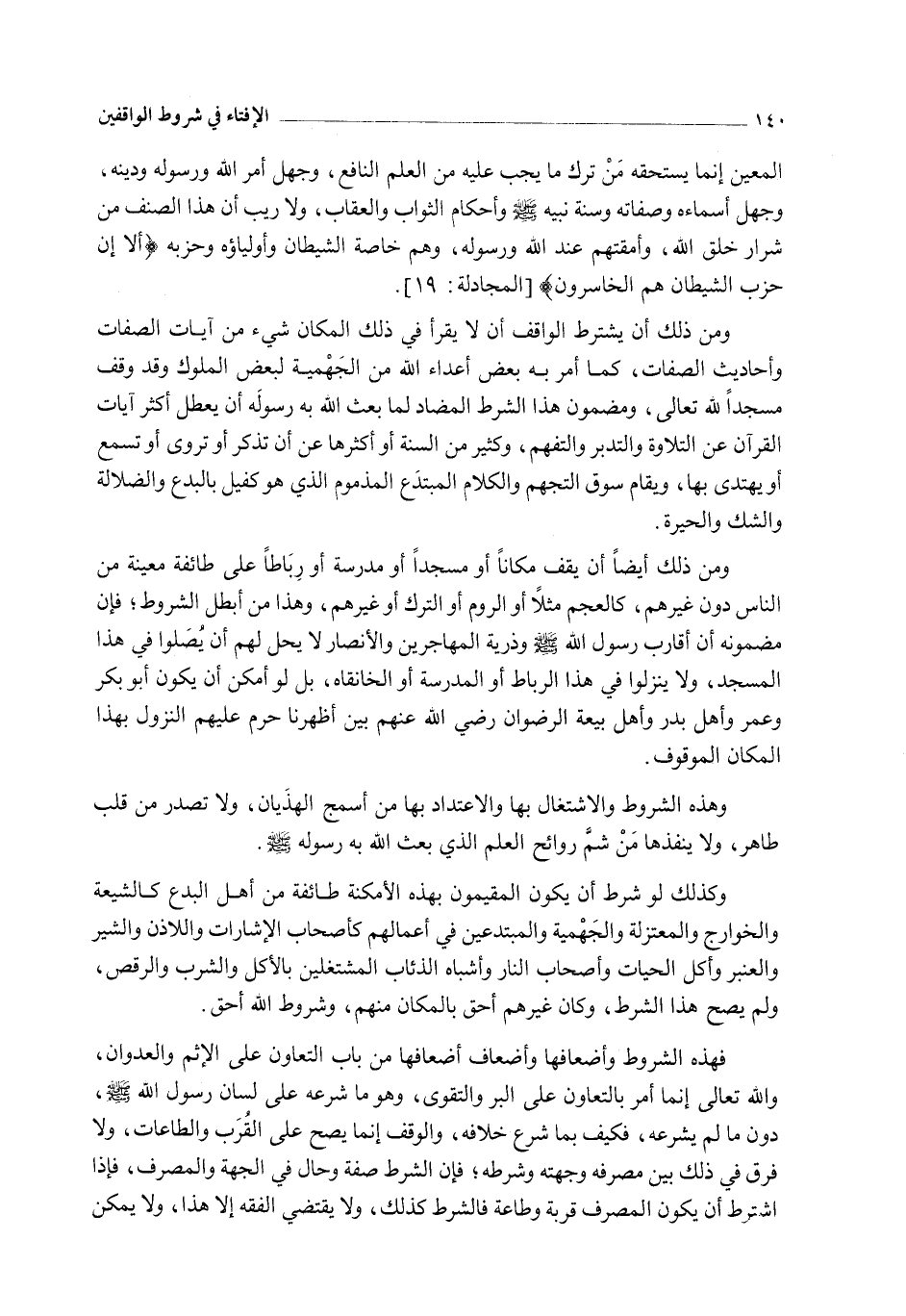 وَمِنْ ذَلِكَ أَنْ يَشْتَرِطَ الْوَاقِفُ أَنْ لَا يُقْرَأَ فِي ذَلِكَ الْمَكَانِ شَيْءٌ مِنْ آيَاتِ الصِّفَاتِ وَأَحَادِيثِ الصِّفَاتِ، كَمَا أَمَرَ بِهِ بَعْضُ أَعْدَاءِ اللَّهِ مِنْ الْجَهْمِيَّةِ لِبَعْضِ الْمُلُوكِ، وَقَدْ وَقَفَ مَسْجِدًا لِلَّهِ تَعَالَى، وَمَضْمُونُ هَذَا الشَّرْطِ الْمُضَادِّ لِمَا بَعَثَ اللَّهُ بِهِ رَسُولَهُ أَنْ يُعَطِّلَ أَكْثَرَ آيَاتِ الْقُرْآنِ عَنْ التِّلَاوَةِ وَالتَّدَبُّرِ وَالْتَفَّهُمْ، وَكَثِيرًا مِنْ السُّنَّةِ أَوْ أَكْثَرَهَا عَنْ أَنْ تُذْكَرَ أَوْ تُرْوَى أَوْ تُسْمَعَ أَوْ يُهْتَدَى بِهَا، وَيُقَامُ سُوقُ التَّجَهُّمِ وَالْكَلَامِ الْمُبْتَدَعِ الْمَذْمُومِ الَّذِي هُوَ كَفِيلٌ بِالْبِدَعِ وَالضَّلَالَةِ وَالشَّكِّ وَالْحَيْرَةِ.