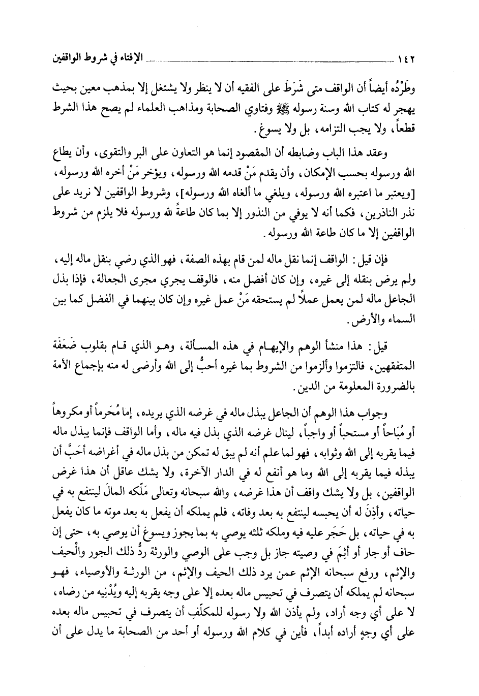 وَجَوَابُ هَذَا الْوَهْمِ أَنَّ الْجَاعِلَ يَبْذُلُ مَالَهُ فِي غَرَضِهِ الَّذِي يُرِيدُهُ، إمَّا مُحَرَّمًا أَوْ مَكْرُوهًا أَوْ مُبَاحًا أَوْ مُسْتَحَبًّا أَوْ وَاجِبًا؛ لِيَنَالَ غَرَضَهُ الَّذِي بَذَلَ فِيهِ مَالَهُ، وَأَمَّا الْوَاقِفُ فَإِنَّمَا يَبْذُلُ مَالَهُ فِيمَا يُقَرِّبُهُ إلَى اللَّهِ وَثَوَابِهِ، فَهُوَ لَمَّا عَلِمَ أَنَّهُ لَمْ يَبْقَ لَهُ تَمَكُّنٌ مِنْ بَذْلِ مَالِهِ فِي أَغْرَاضِهِ أَحَبَّ أَنْ يَبْذُلَهُ فِيمَا يُقَرِّبُهُ إلَى اللَّهِ وَمَا هُوَ أَنْفَعُ لَهُ فِي الدَّارِ الْآخِرَةِ، وَلَا يَشُكُّ عَاقِلٌ أَنَّ هَذَا غَرَضُ الْوَاقِفِينَ، بَلْ وَلَا يَشُكُّ وَاقِفٌ أَنَّ هَذَا غَرَضُهُ، وَاَللَّهُ سُبْحَانَهُ وَتَعَالَى مَلَّكَهُ الْمَالَ؛ لِيَنْتَفِعَ بِهِ فِي حَيَاتِهِ، وَأَذِنَ لَهُ أَنْ يَحْبِسَهُ؛ لِيَنْتَفِعَ بِهِ بَعْدَ وَفَاتِهِ، فَلَمْ يُمَلِّكْهُ أَنْ يَفْعَلَ بِهِ بَعْدَ مَوْتِهِ مَا كَانَ يَفْعَلُ بِهِ فِي حَيَاتِهِ، بَلْ حَجَرَ عَلَيْهِ فِيهِ، وَمَلَّكَهُ ثُلُثَهُ يُوصِي بِهِ بِمَا يَجُوزُ وَيَسُوغُ أَنْ يُوصِيَ بِهِ، حَتَّى إنْ حَافَ أَوْ جَارَ أَوْ أَثِمَ فِي وَصِيَّتِهِ جَازَ بَلْ وَجَبَ عَلَى الْوَصِيِّ وَالْوَرَثَةِ رَدُّ ذَلِكَ الْجَوْرِ وَالْحَيْفِ وَالْإِثْمِ، وَرَفَعَ سُبْحَانَهُ الْإِثْمَ عَمَّنْ يَرُدُّ ذَلِكَ الْحَيْفَ وَالْإِثْمَ، مِنْ الْوَرَثَةِ وَالْأَوْصِيَاءِ، فَهُوَ سُبْحَانَهُ لَمْ يُمَلِّكْهُ أَنْ يَتَصَرَّفَ فِي تَحْبِيسِ مَالِهِ بَعْدَهُ إلَّا عَلَى وَجْهٍ يُقَرِّبُهُ إلَيْهِ، وَيُدْنِيهِ مِنْ رِضَاهُ، لَا عَلَى أَيِّ وَجْهٍ أَرَادَ، وَلَمْ يَأْذَنْ اللَّهُ وَلَا رَسُولُهُ لِلْمُكَلَّفِ أَنْ يَتَصَرَّفَ فِي تَحْبِيسِ مَالِهِ بَعْدَهُ عَلَى أَيِّ وَجْهٍ أَرَادَهُ أَبَدًا.