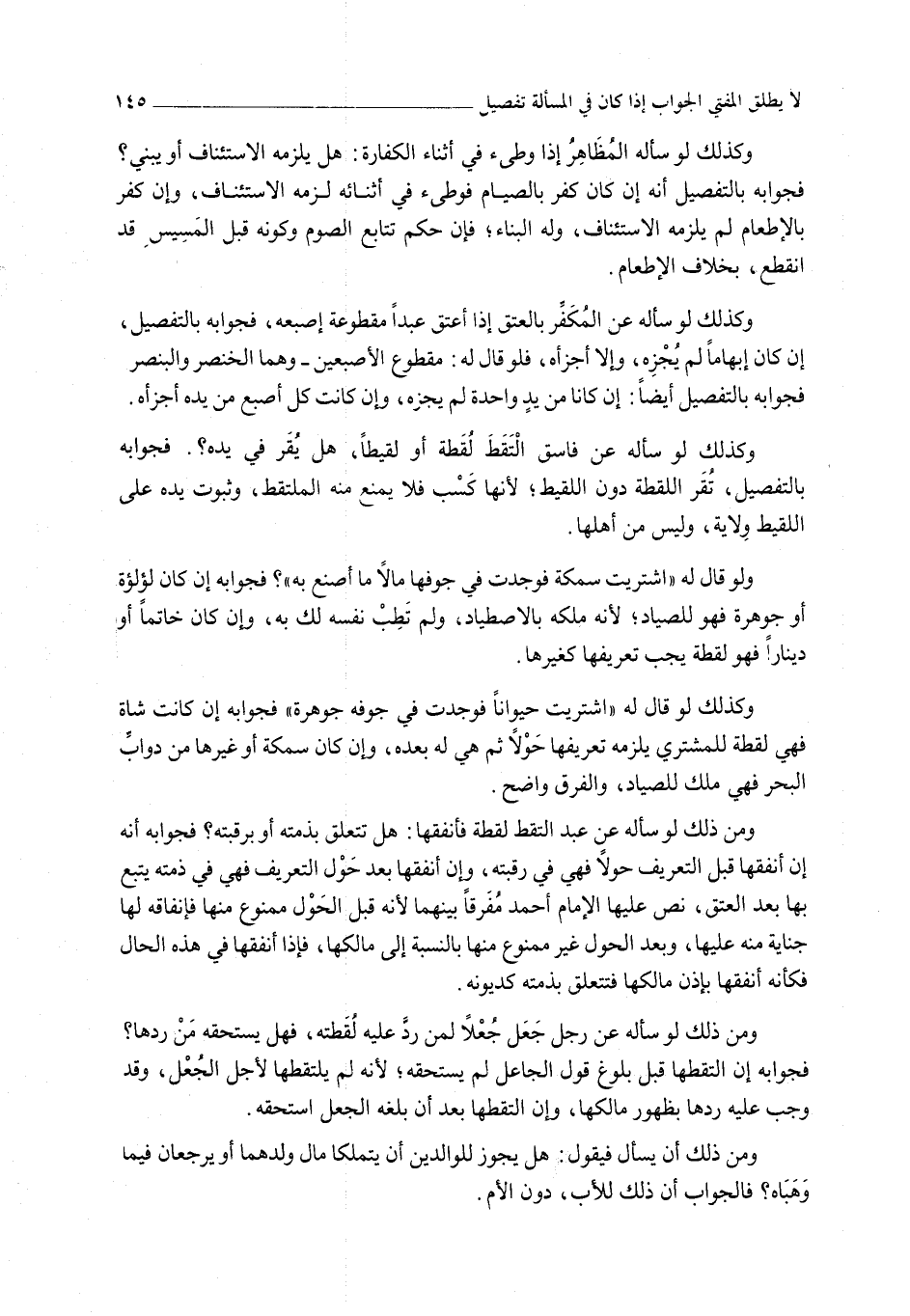 وَمِنْ ذَلِكَ لَوْ سَأَلَهُ عَنْ رَجُلٍ جَعَلَ جُعْلًا لِمَنْ رَدَّ عَلَيْهِ لُقَطَتَهُ، فَهَلْ يَسْتَحِقُّهُ مَنْ رَدَّهَا؟ فَجَوَابُهُ إنْ الْتَقَطَهَا قَبْلَ بُلُوغِ قَوْلِ الْجَاعِلِ لَمْ يَسْتَحِقَّهُ؛ لِأَنَّهُ لَمْ يَلْتَقِطْهَا لِأَجْلِ الْجُعْلِ، وَقَدْ وَجَبَ عَلَيْهِ رَدُّهَا بِظُهُورِ مَالِكِهَا، وَإِنْ الْتَقَطَهَا بَعْدَ أَنْ بَلَغَهُ الْجُعْلُ اسْتَحَقَّهُ، وَمِنْ ذَلِكَ أَنْ يَسْأَلَ فَيَقُولُ: هَلْ يَجُوزُ لِلْوَالِدَيْنِ أَنْ يَتَمَلَّكَا مَالَ وَلَدِهِمَا أَوْ يَرْجِعَانِ فِيمَا وَهَبَاهُ؟ فَالْجَوَابُ أَنَّ ذَلِكَ لِلْأَبِ، دُونَ الْأُمِّ.