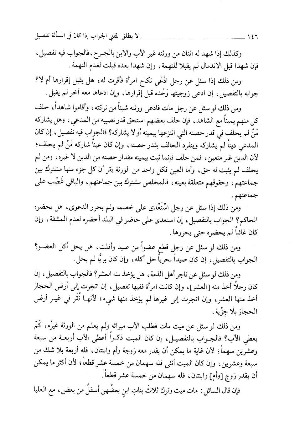 وَمِنْ ذَلِكَ لَوْ سُئِلَ عَنْ تَاجِرِ أَهْلِ الذِّمَّةِ، هَلْ يُؤْخَذُ مِنْهُ الْعُشْرُ؟ فَالْجَوَابُ بِالتَّفْصِيلِ، إنْ كَانَ رَجُلًا أُخِذَ مِنْهُ [الْعُشْرُ] ، وَإِنْ كَانَتْ امْرَأَةً فَفِيهَا تَفْصِيلٌ، إنْ اتَّجَرَتْ إلَى أَرْضِ الْحِجَازِ أُخِذَ مِنْهَا الْعُشْرُ، وَإِنْ اتَّجَرَتْ إلَى غَيْرِهَا لَمْ يُؤْخَذْ مِنْهَا شَيْءٌ؛ لِأَنَّهَا تُقَرُّ فِي غَيْرِ أَرْضِ الْحِجَازِ بِلَا جِزْيَةٍ.
